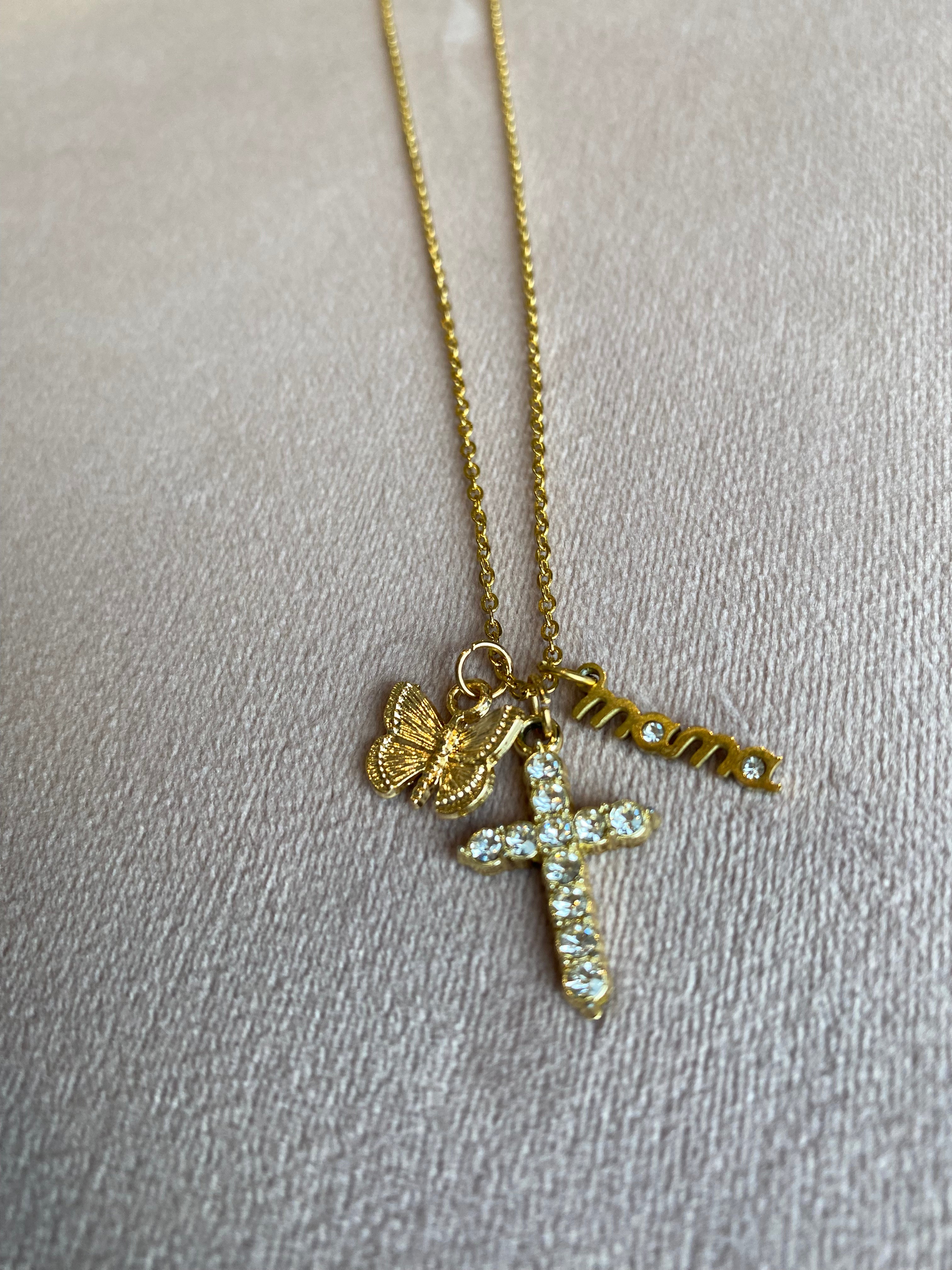 The One:Nine Exclusive Mama Cubic Zirconia Cross Charm Necklace is a meaningful keepsake designed for the bold + beautiful mamas out there. This dainty gold-tone necklace features three chic charms — a sparkling cubic zirconia cross, a “mama” script charm with shimmering stones, + a delicate butterfly for a touch of whimsy. It’s feminine, faith-inspired, + perfect for everyday wear or gifting to someone special.