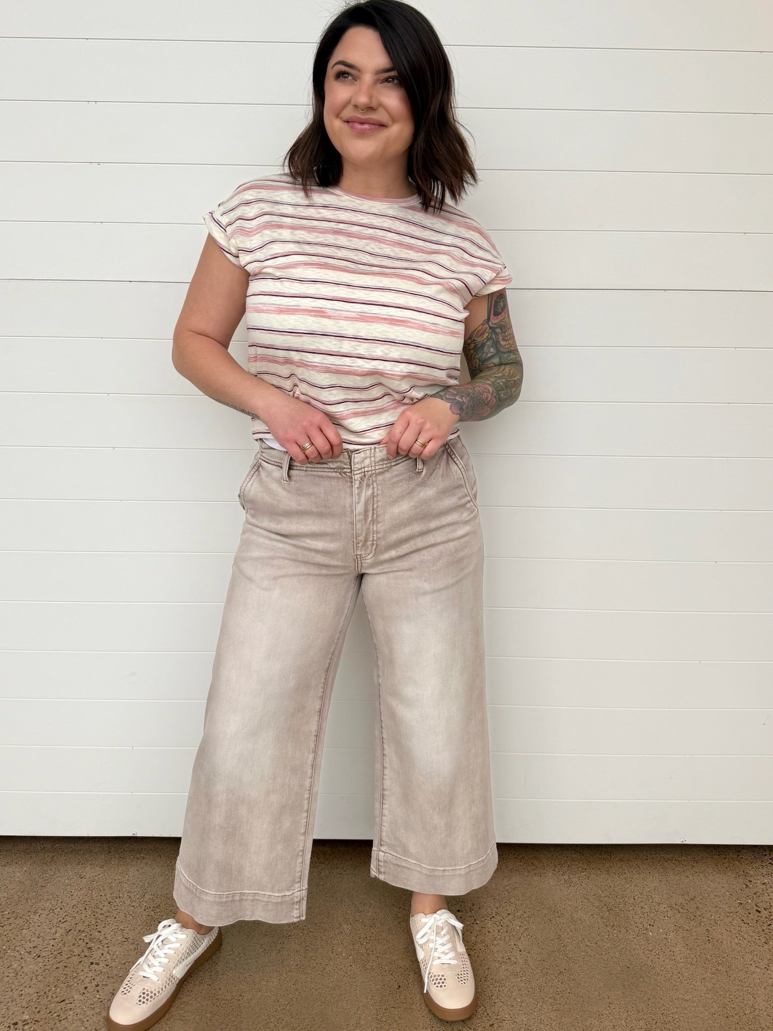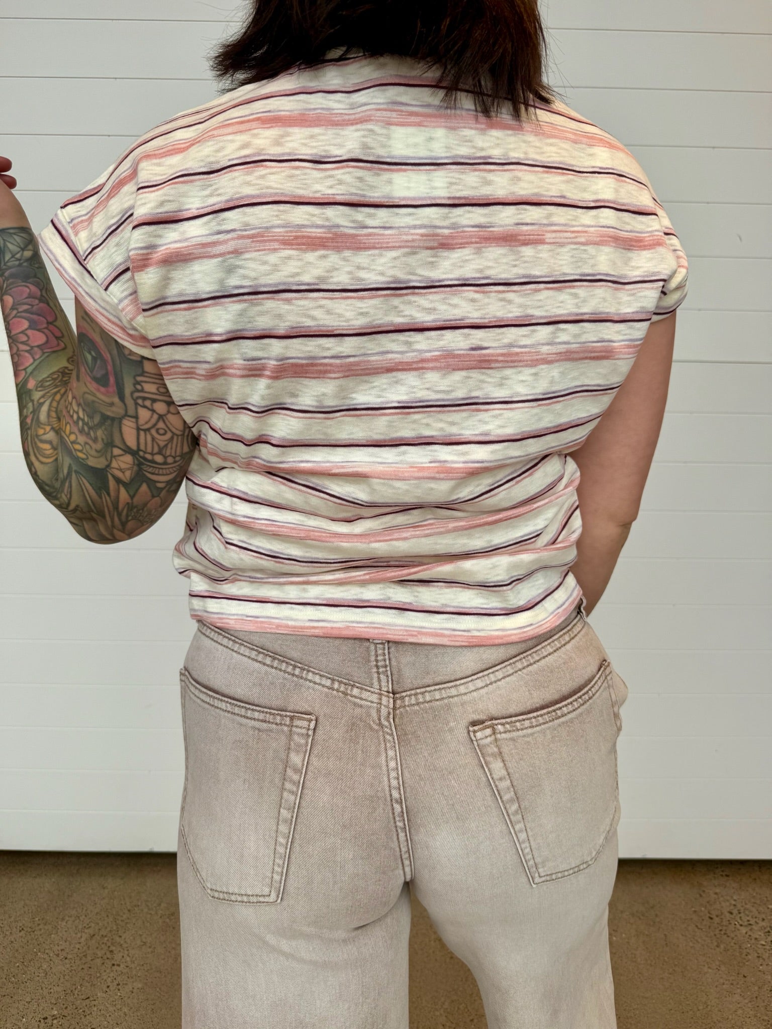 Meet your new “wear it on repeat” tee. The Everly Short Sleeve Striped Tee is that effortless favorite you reach for when you want to feel cute, comfy + totally put together without even trying. With its soft stripes, casual rolled sleeves + easygoing silhouette, it’s the kind of top that makes everyday outfits feel a little more fun.
