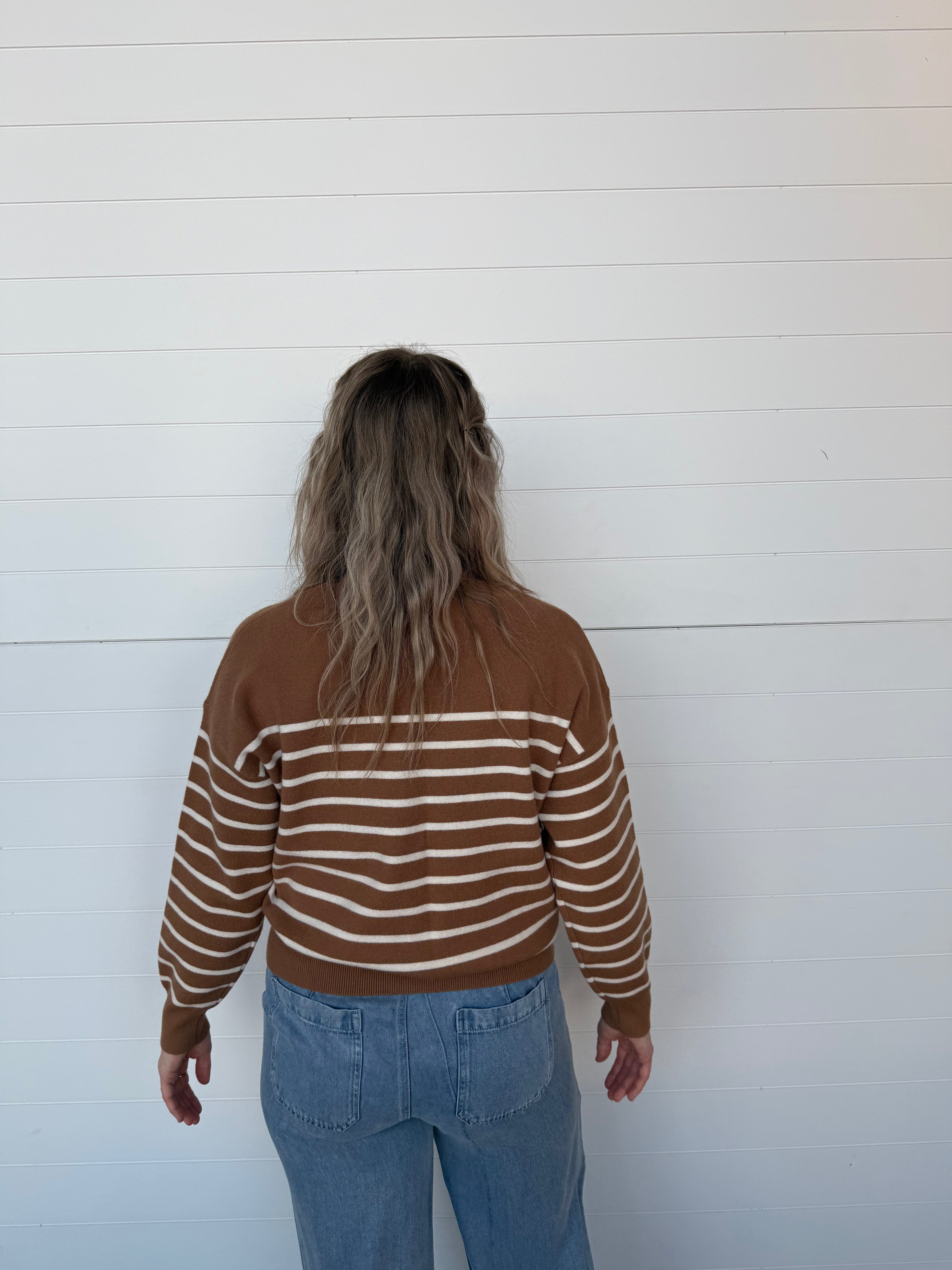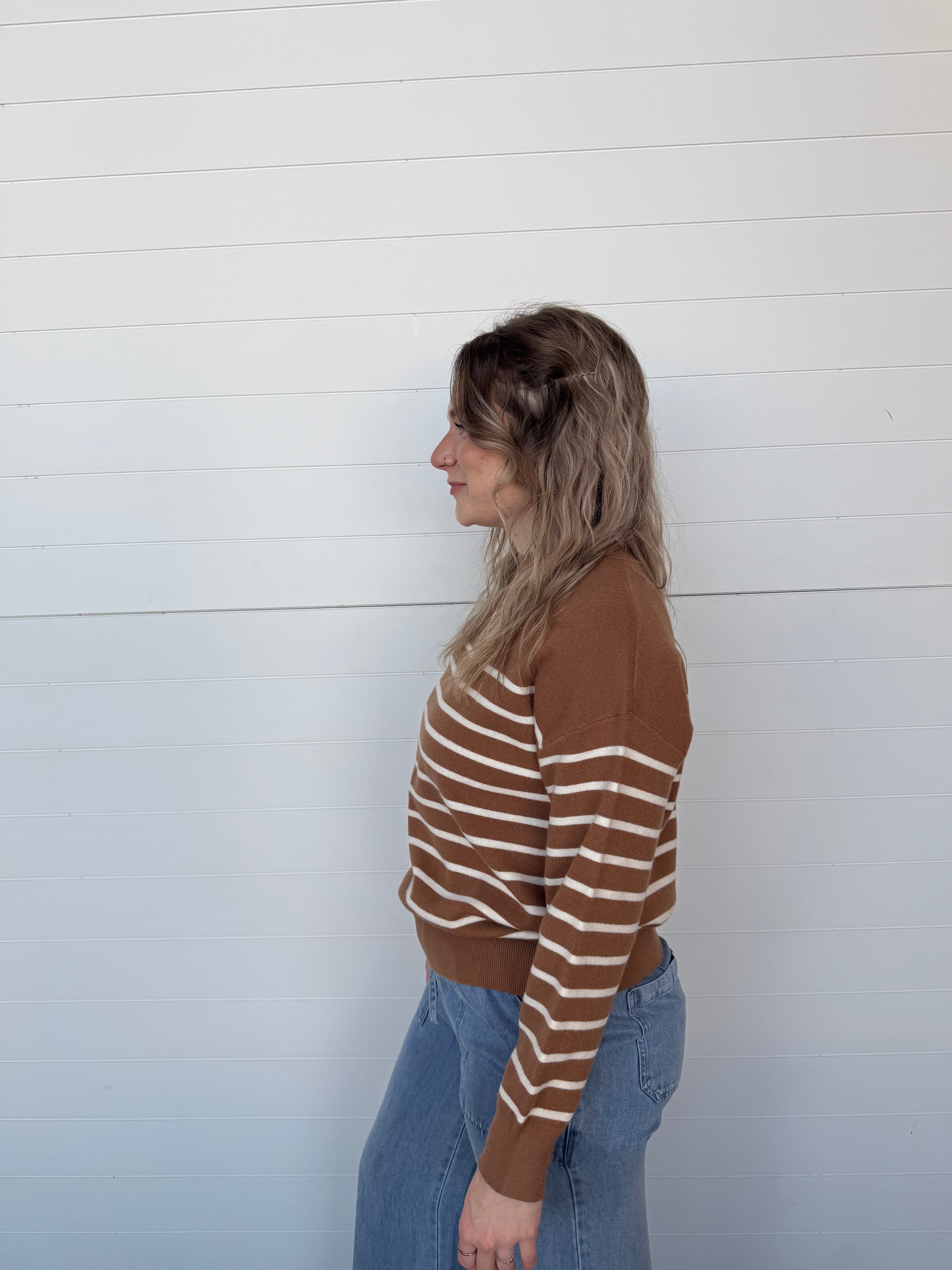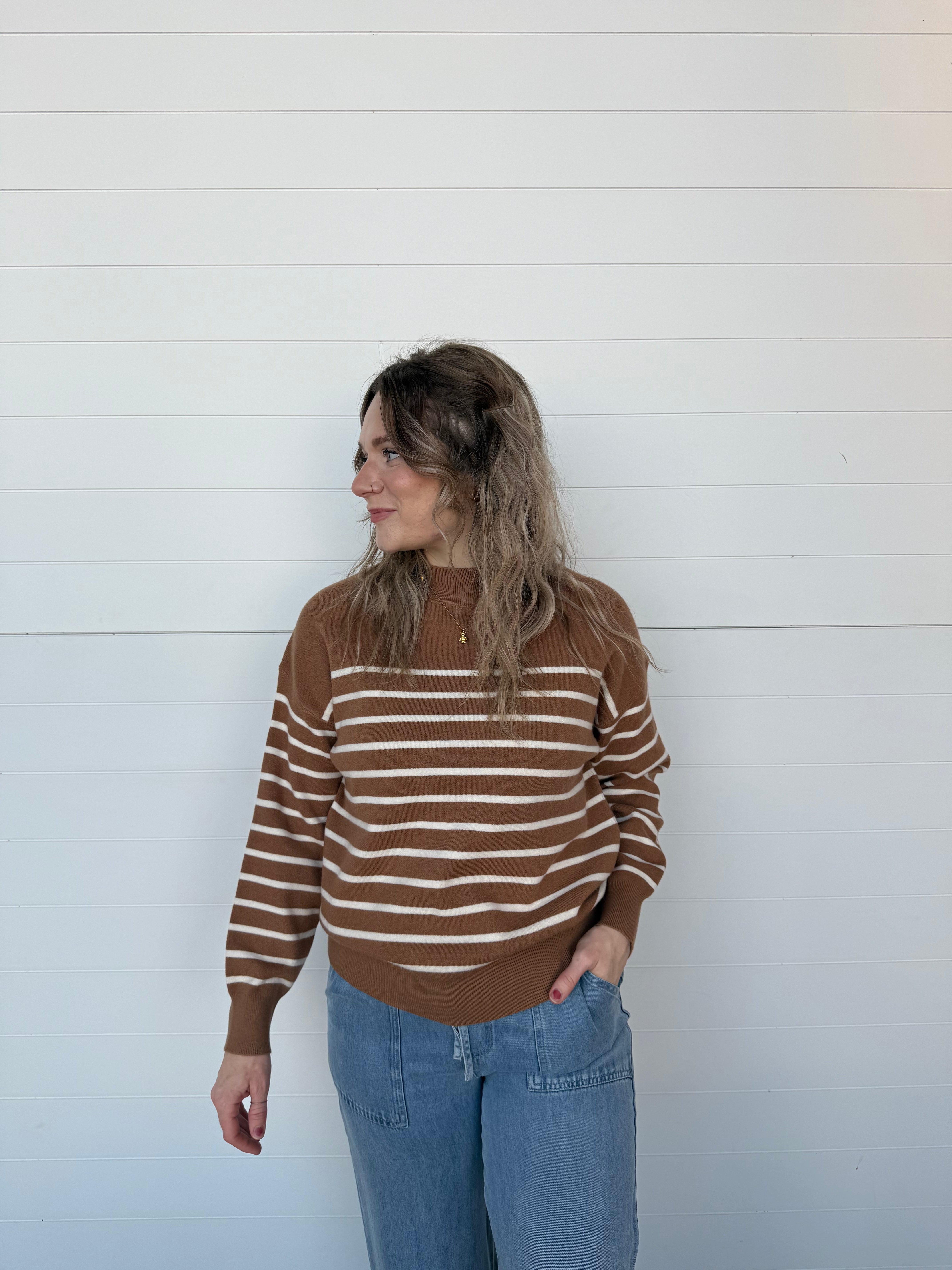Classic stripes meet modern comfort in The Hillary Striped Sweater. This relaxed fit knit is the definition of cozy-chic — featuring a warm caramel hue with crisp white stripes, a soft mock neckline, and a slightly boxy silhouette. It’s elevated enough for the office yet comfy enough for lounging at home. Pair it with denim for a casual look or style it with the matching Hillary Knit Pant for a coordinated, polished set.