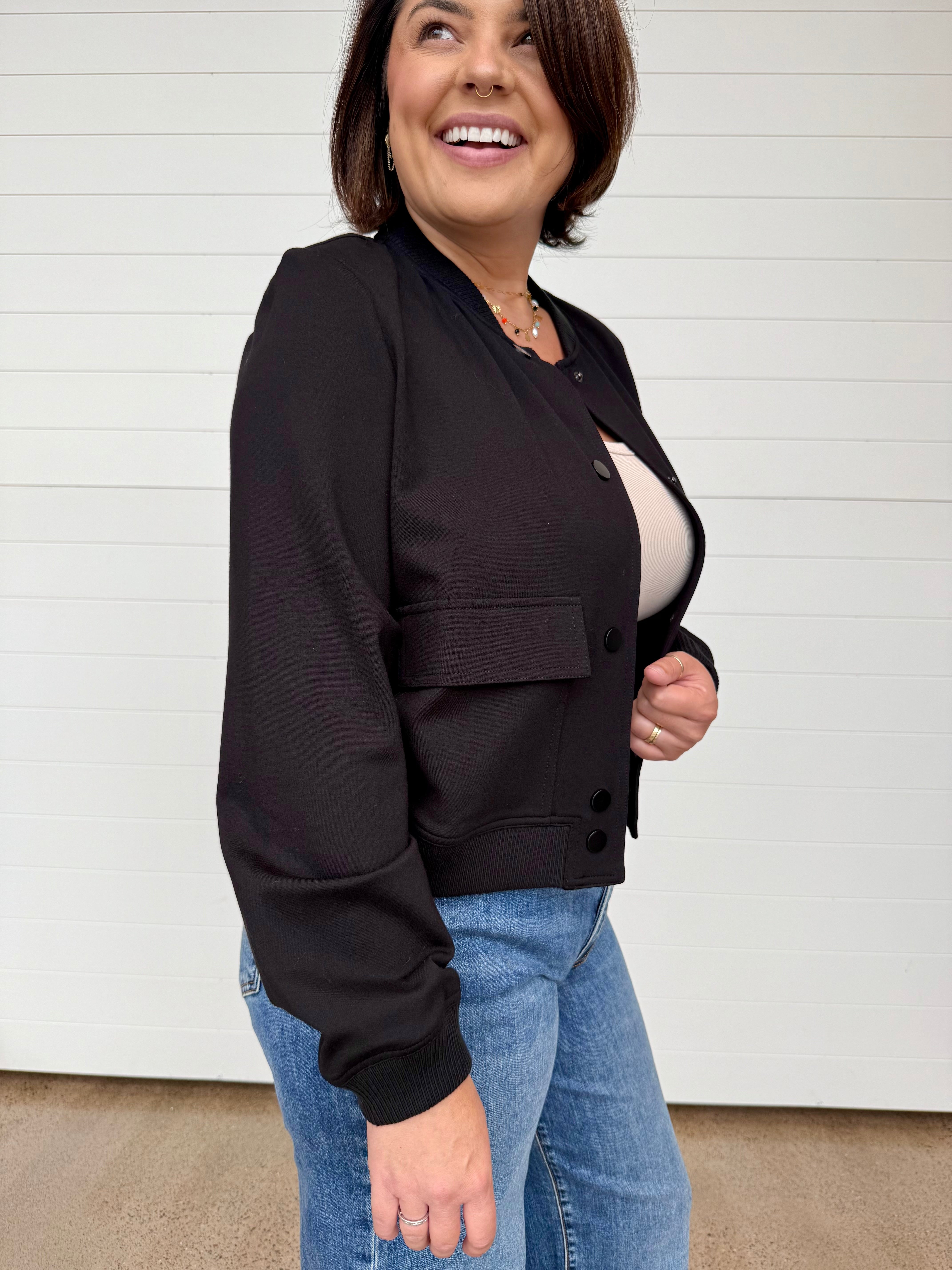It features a snap button front, front utility pockets for a little edge, + stretchy ribbed details at the neckline, cuffs + hem for that perfect comfy finish. Whether you're layering it over your favorite knit, graphic tee or casual dress, this jacket adds just the right touch of cool to any look.