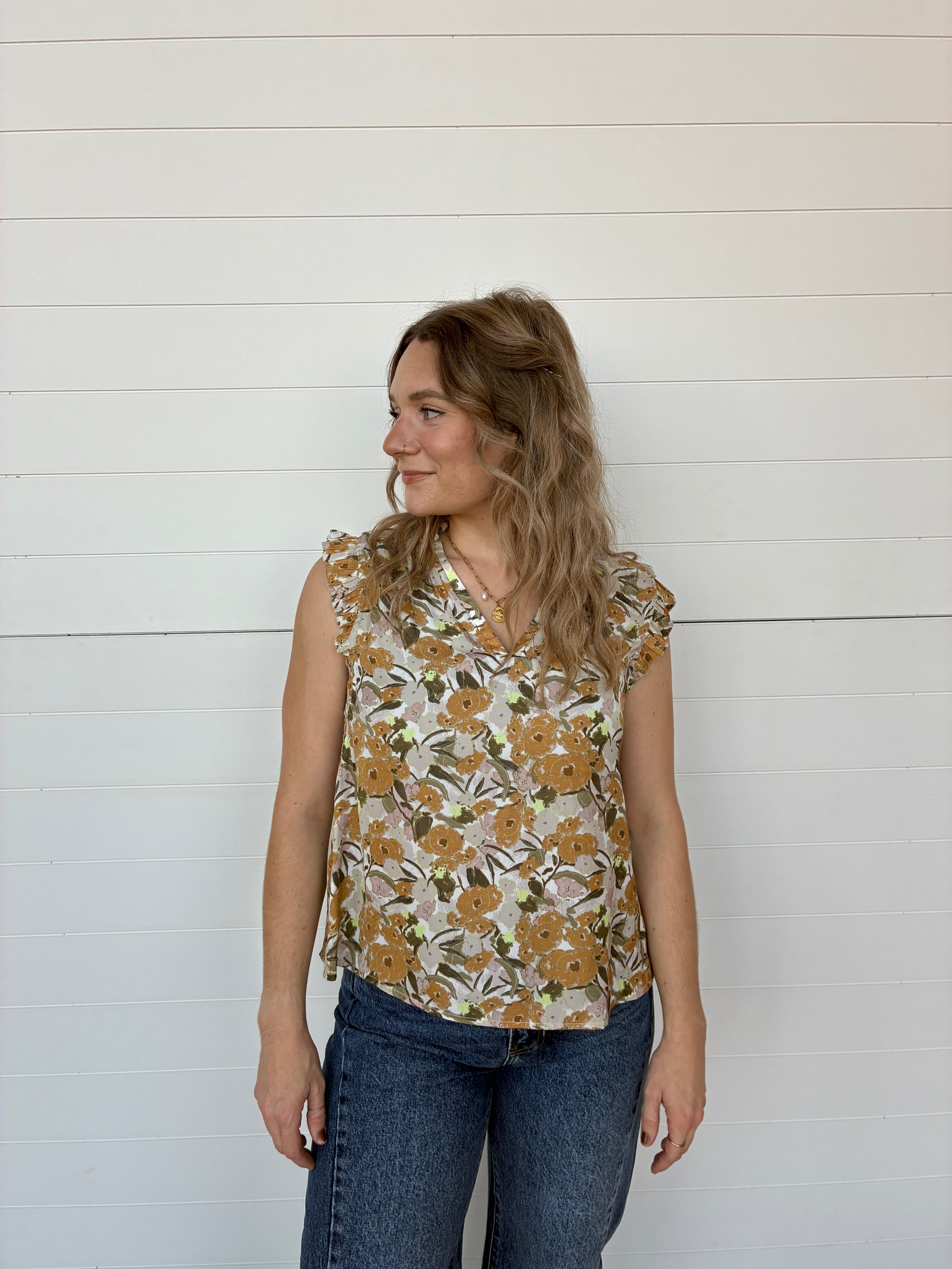 The Della Floral Blouse captures the beauty of fall florals in a light, feminine silhouette. Featuring soft golden hues with subtle earthy tones, this blouse adds warmth + charm to any outfit. The ruffled cap sleeves + split neckline bring a romantic touch, while the relaxed fit keeps it effortlessly wearable. Whether you dress it up for the office or style it casually with denim, this floral top brings timeless appeal to your wardrobe.