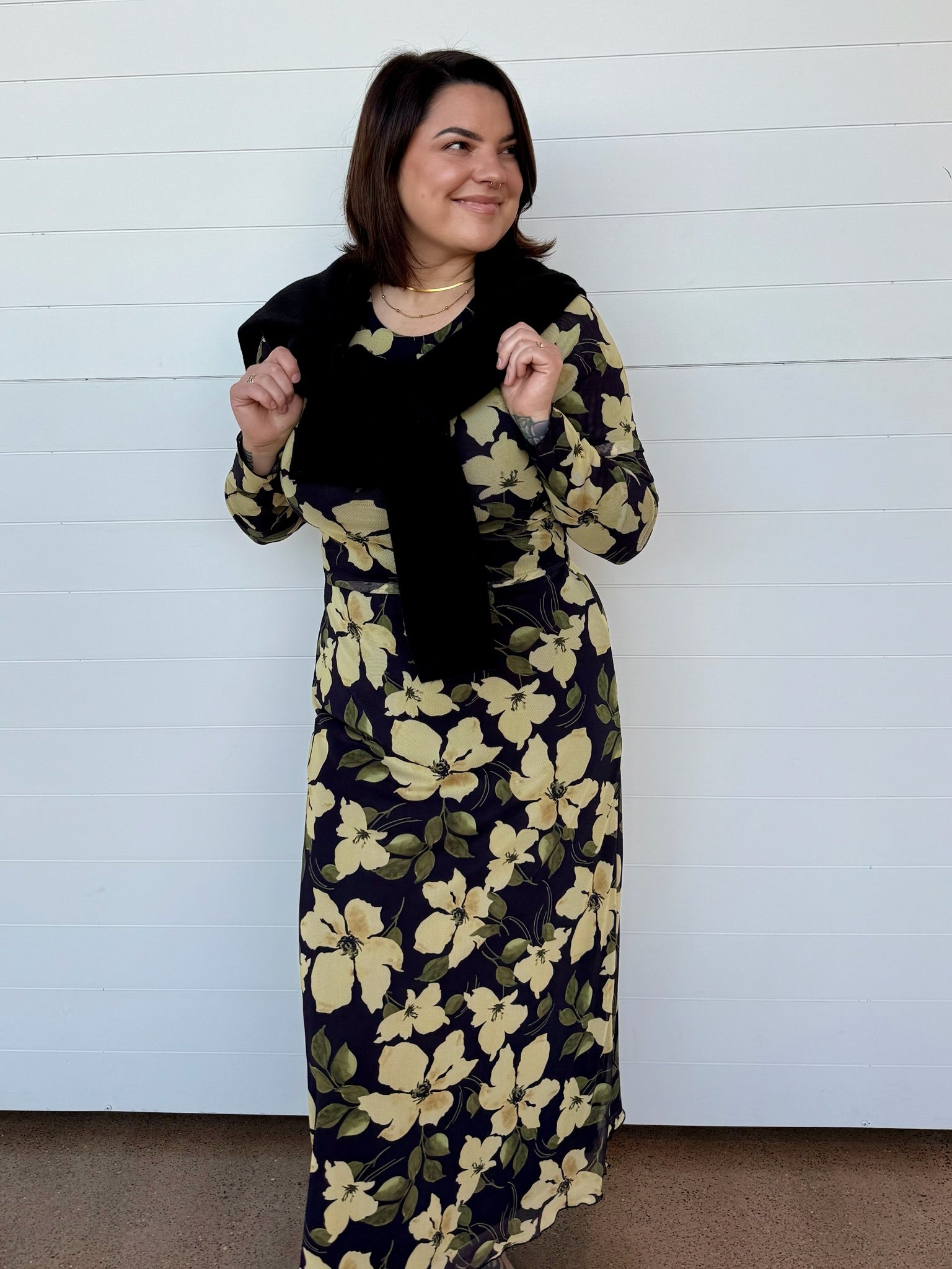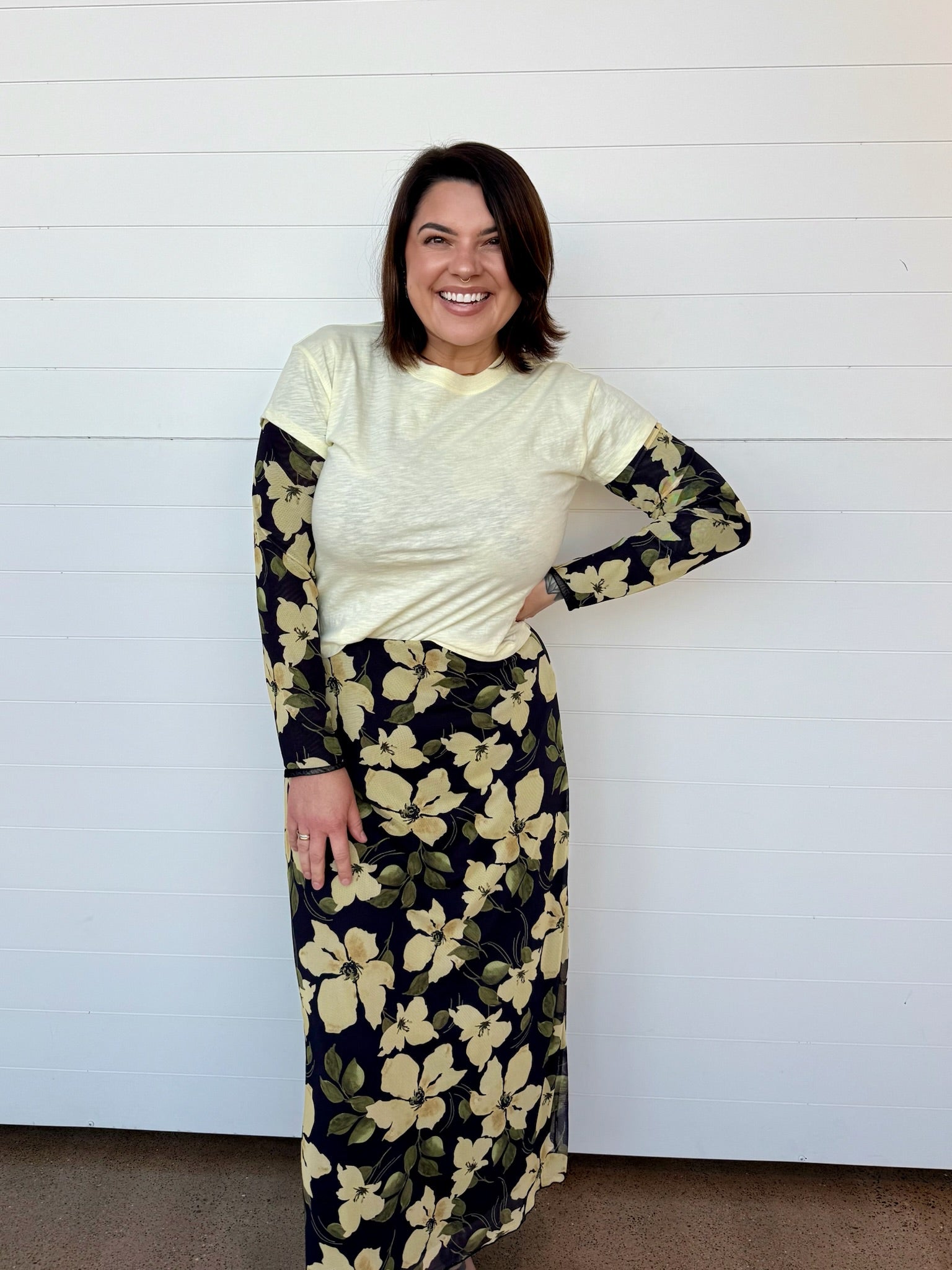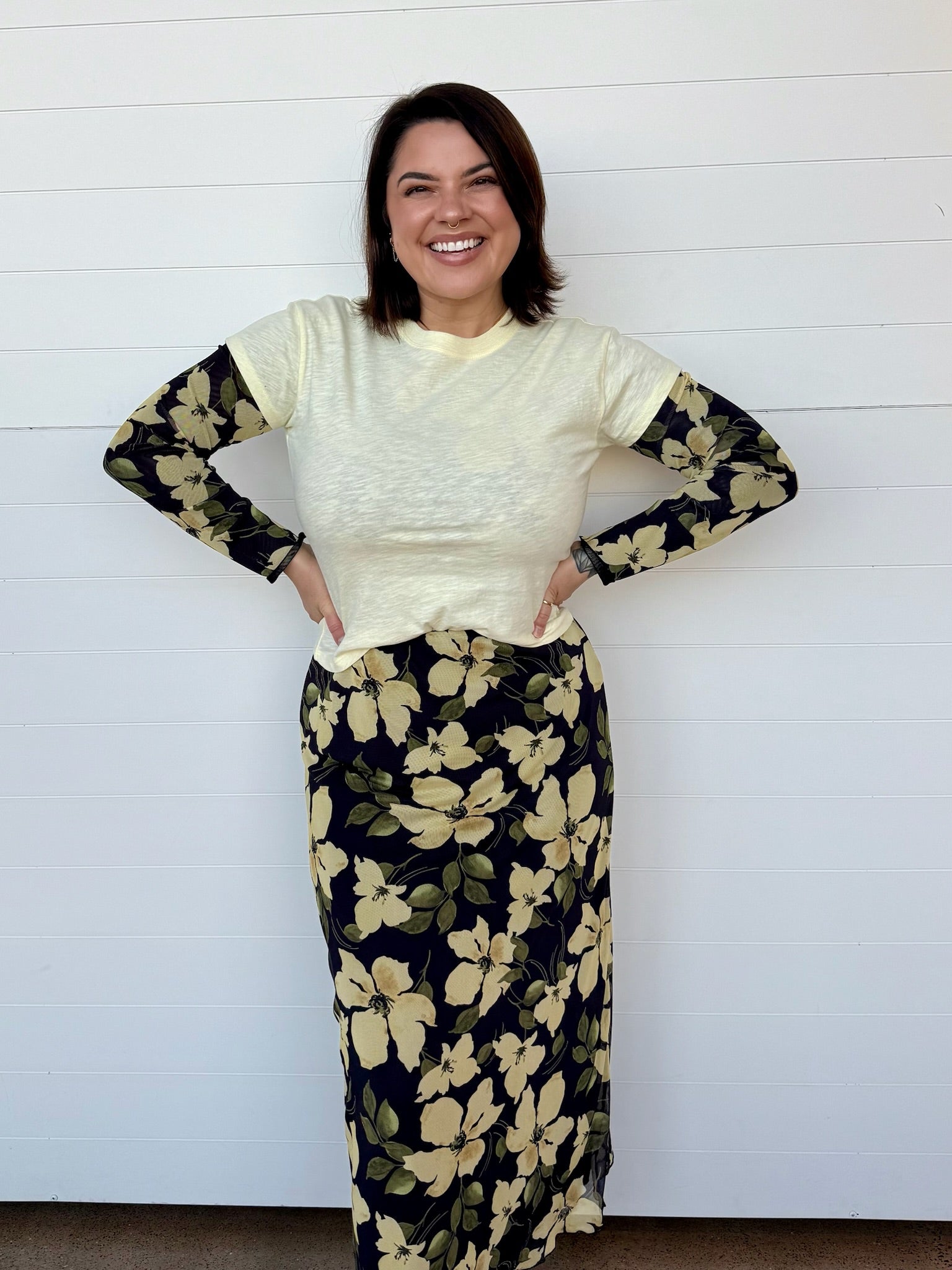 The Eda Ren Floral Mesh Maxi Skirt is your new statement piece for any season. With its bold floral print set against a dark base, this skirt gives off effortlessly chic vibes. Designed with a fitted silhouette that flatters your shape, it’s both feminine + modern. The mesh overlay adds texture + flow, making it a versatile piece you can dress up or down.