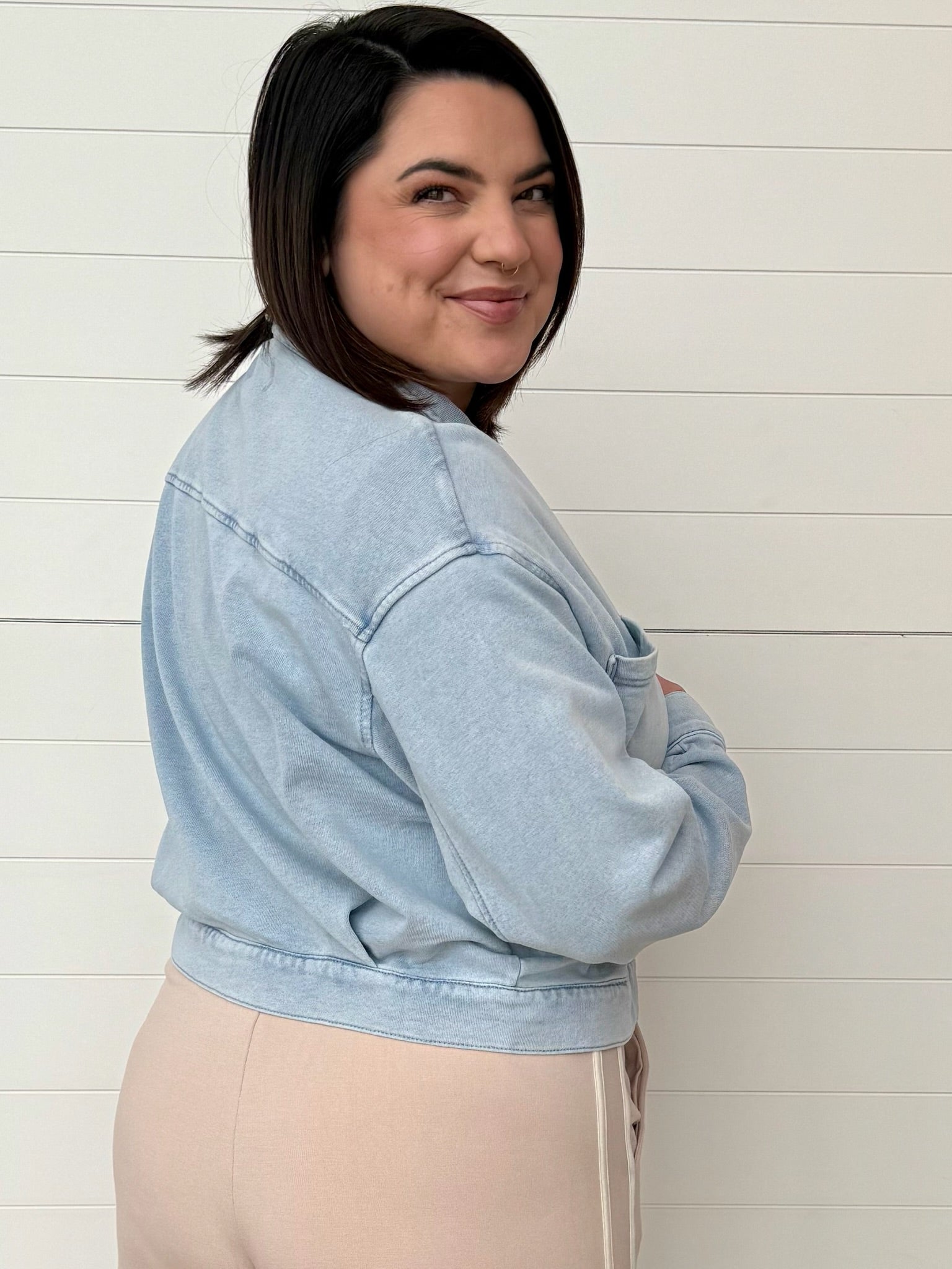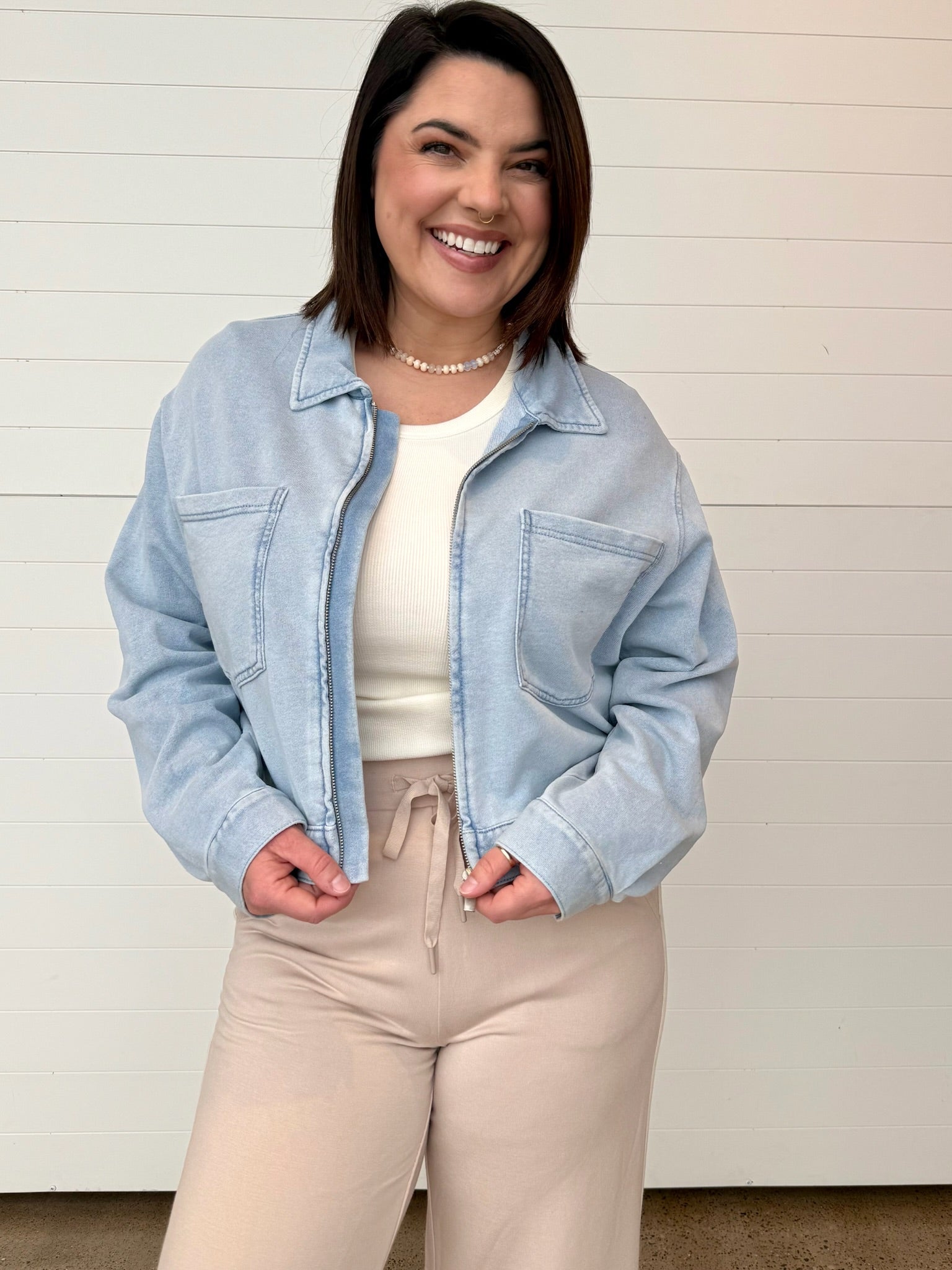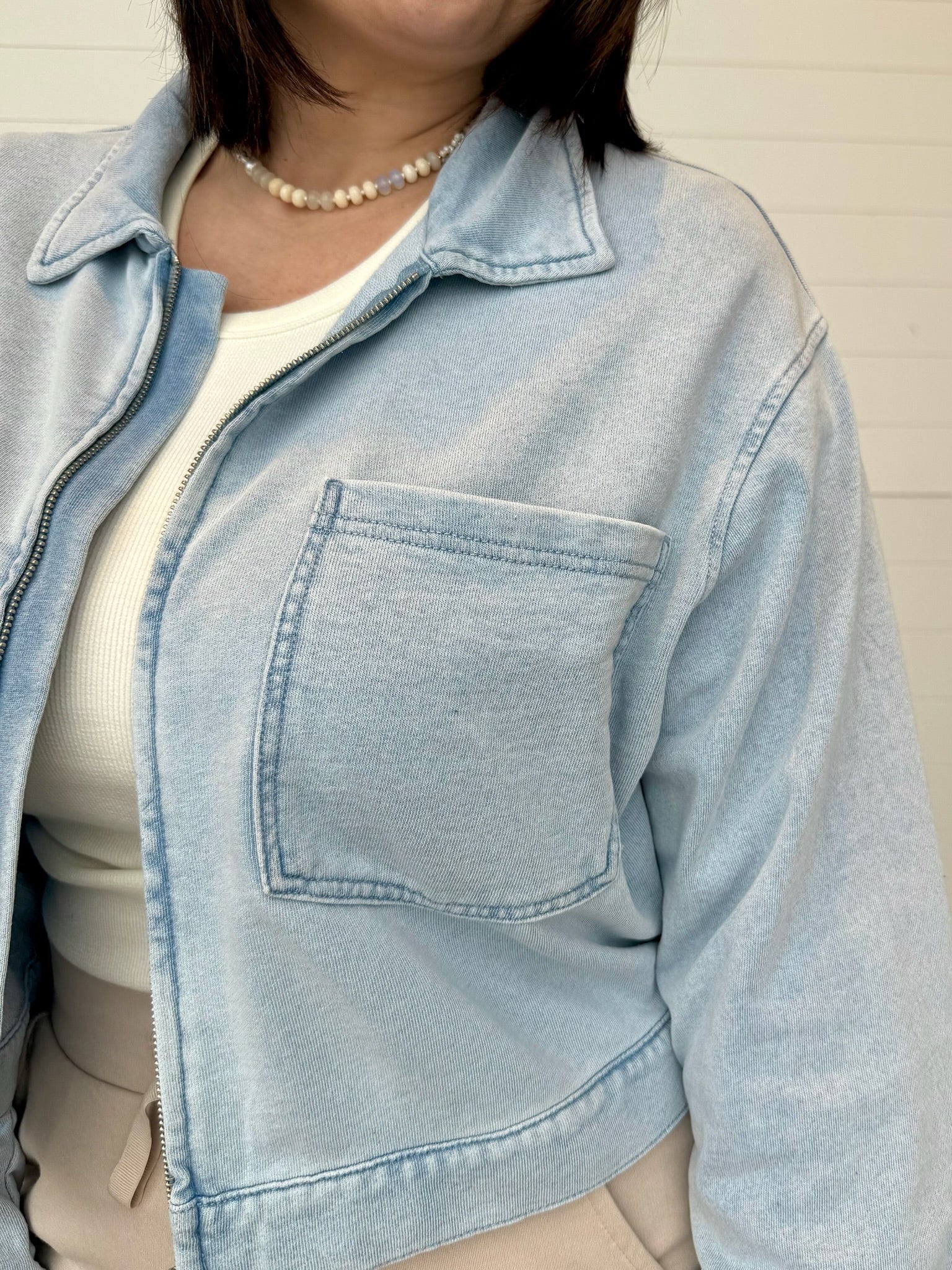 It features a zip-front closure, functional pockets, + a slightly cropped silhouette that works perfectly with high-rise denim, trousers, or matching knit denim bottoms for a cool coordinated moment. Polished enough to elevate your outfit, comfortable enough for all-day wear.