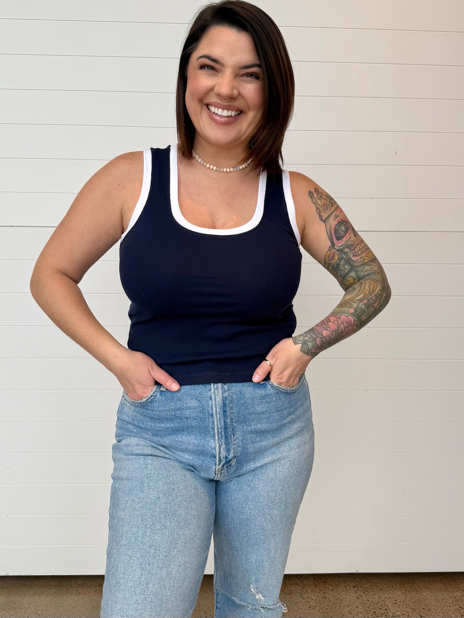 From casual denim days to layering under jackets + cardigans, the Sirena Tank is one of those easy pieces that instantly pulls a look together.