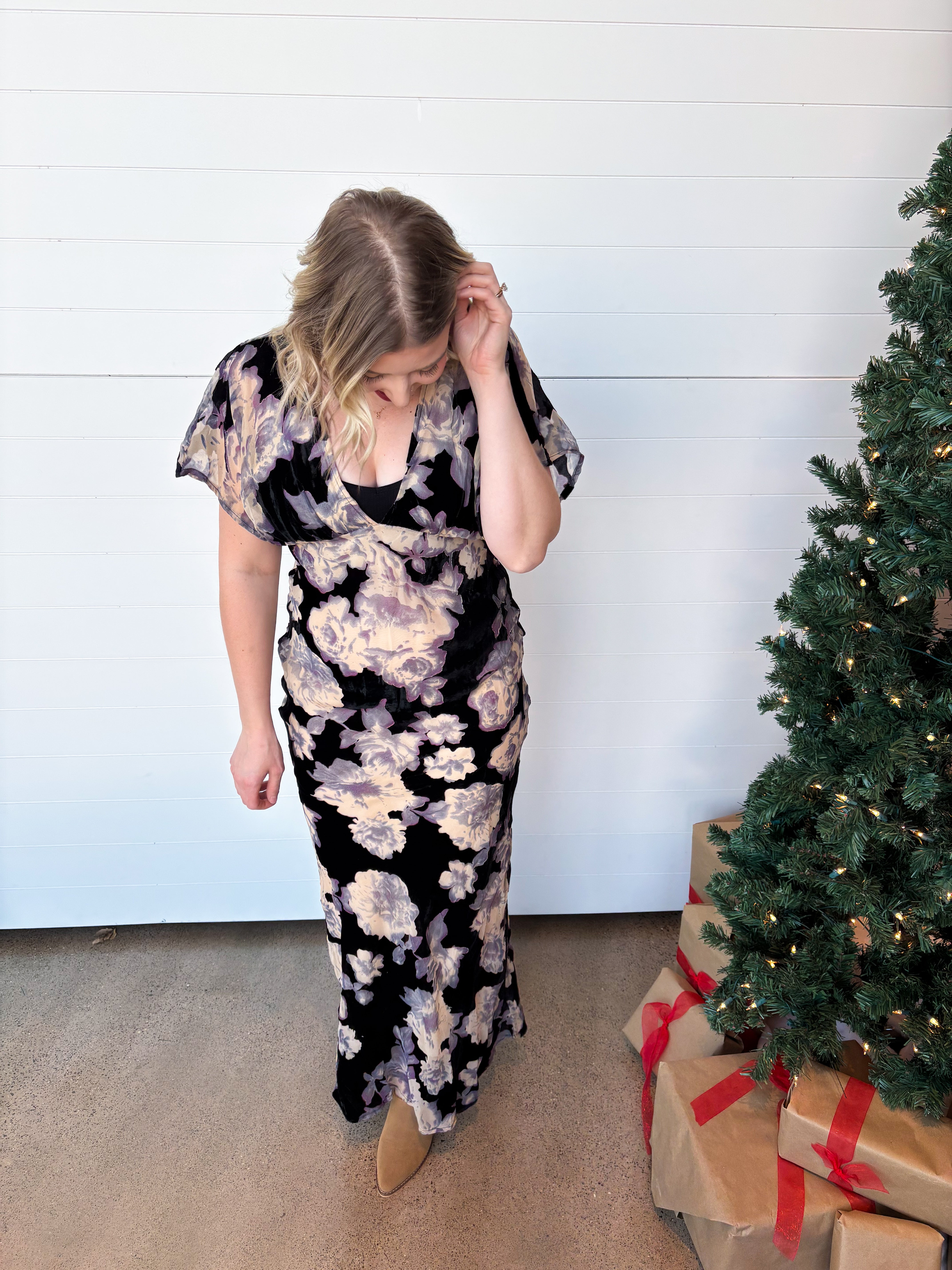 The Ember Flora Velvet Maxi Dress is the definition of effortless elegance. Crafted from a luxe velvet blend with a soft, romantic drape, this dress features a stunning floral print that feels timeless yet modern. The deep V-neckline, flutter sleeves + open back tie detail add just the right touch of femininity. Perfect for your next wedding, holiday soirée, or any special night out, this piece will have you feeling confident + chic from every angle.