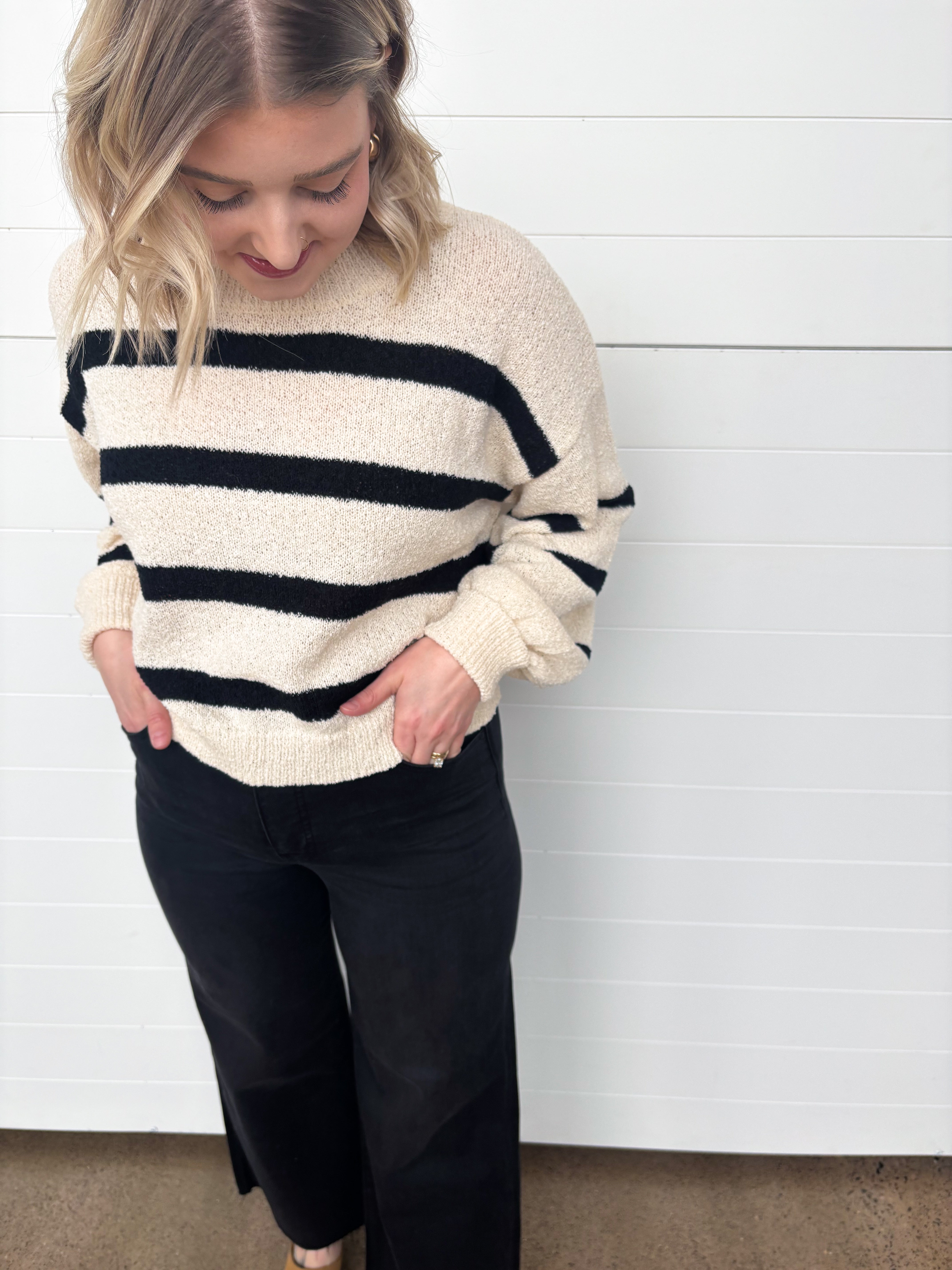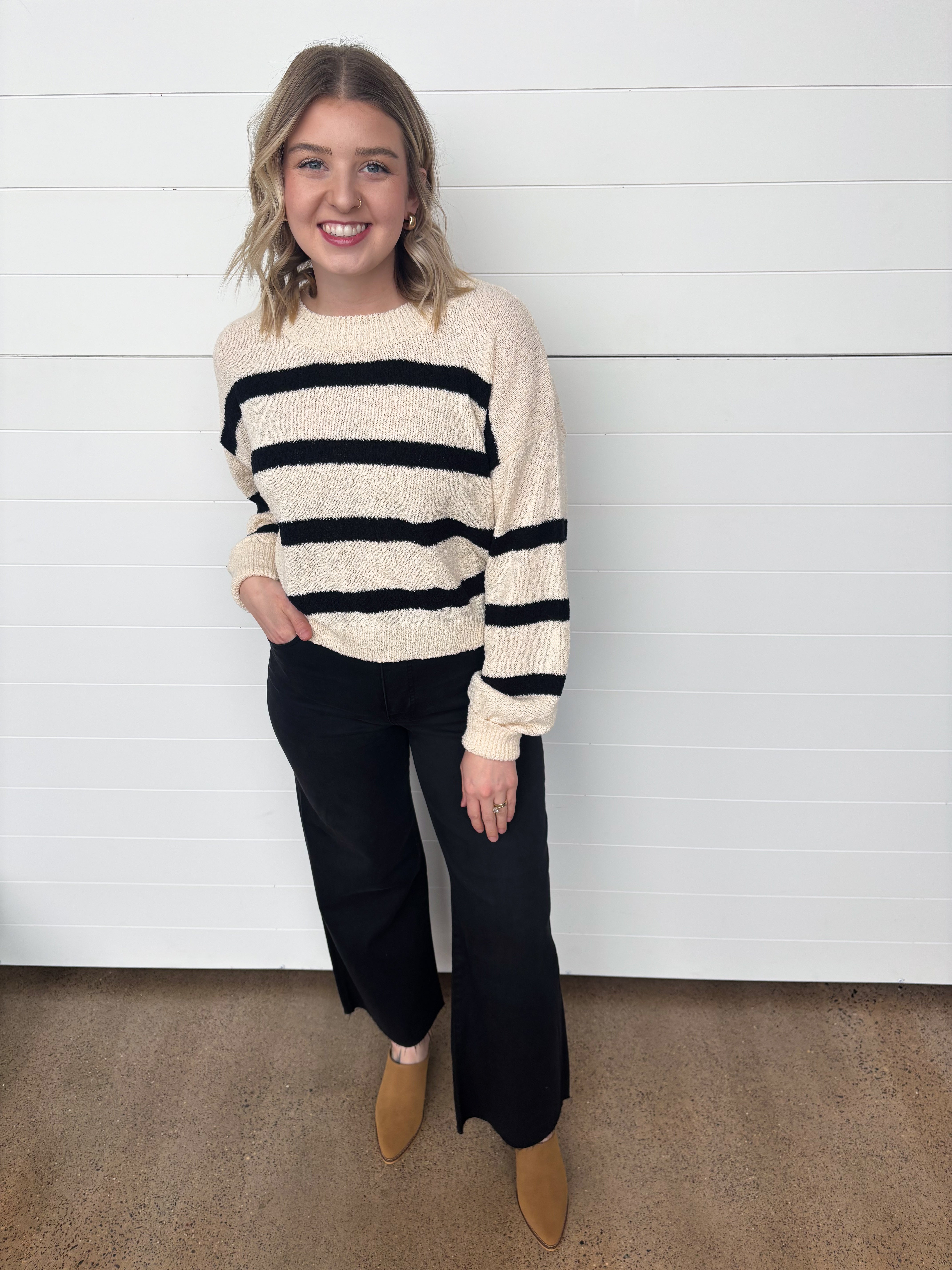 The Rowan Striped Sweater – Black + Ivory Cropped Knit | One:Nine Boutique