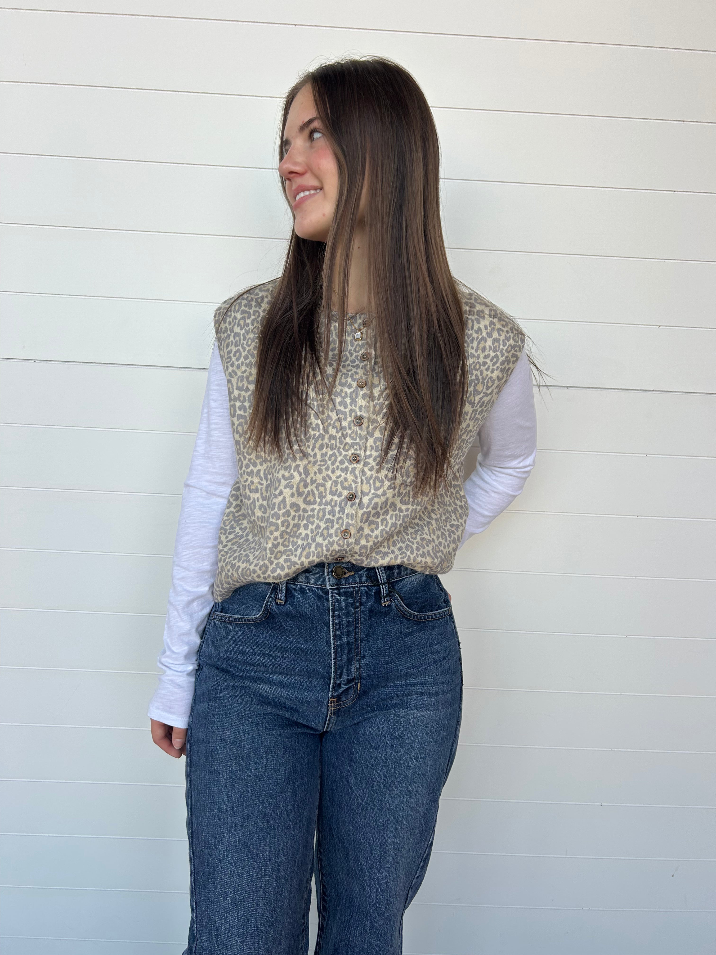 Leopard is so in right now—+ this piece is the easiest way to hop on the trend without going overboard. Wear it solo as a sweater tank or layer it over your favorite long sleeves for that cozy layered look we love. Pair with denim, trousers, or even a mini skirt—this one goes with everything.