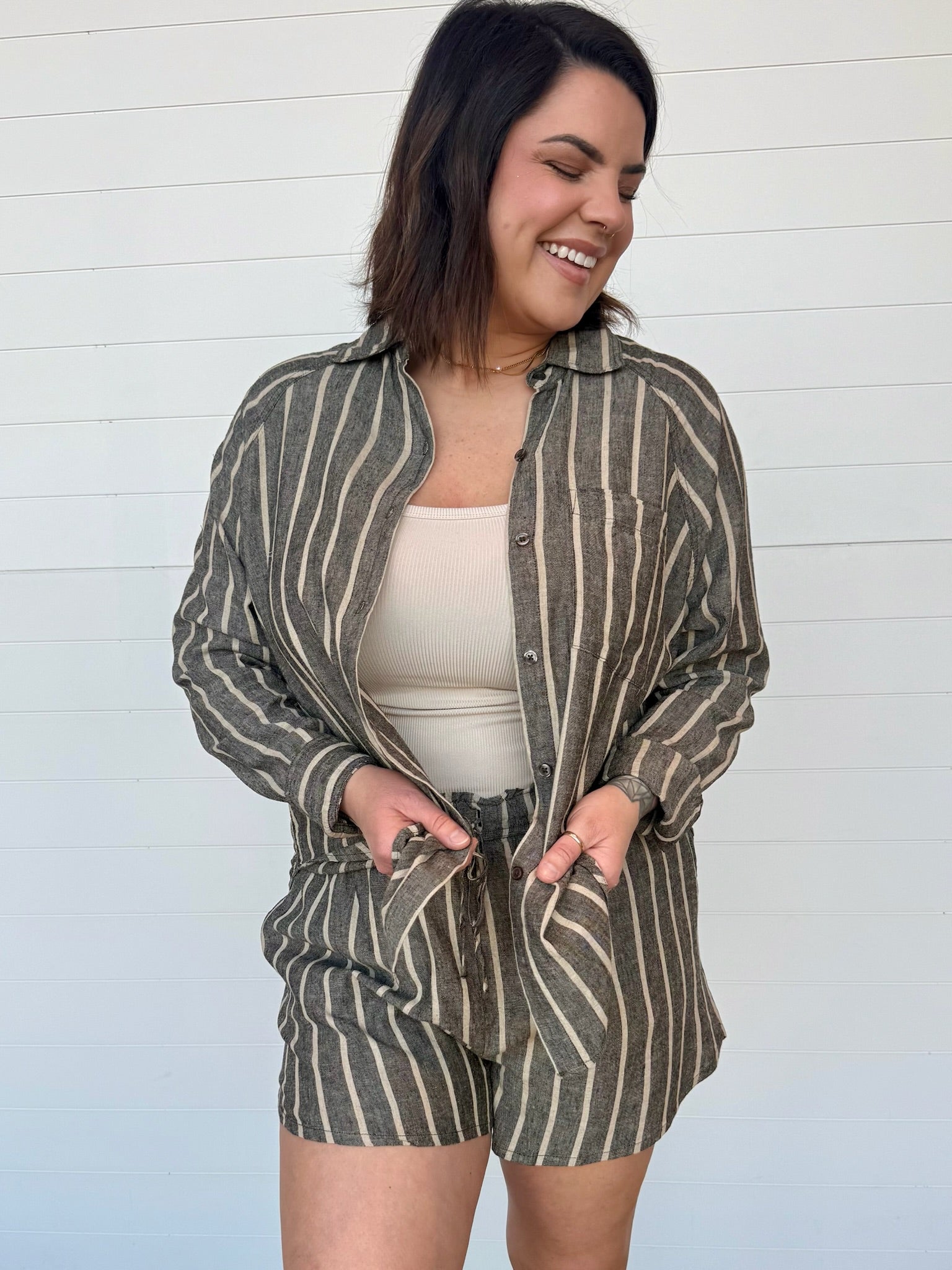 Easy, breezy + made for warm days. The Perfect Line Shorts feature a relaxed silhouette with a comfortable drawstring waist that makes getting dressed effortless. The lightweight linen blend keeps things cool + breathable, while the subtle stripe adds a timeless, elevated feel you’ll wear on repeat.