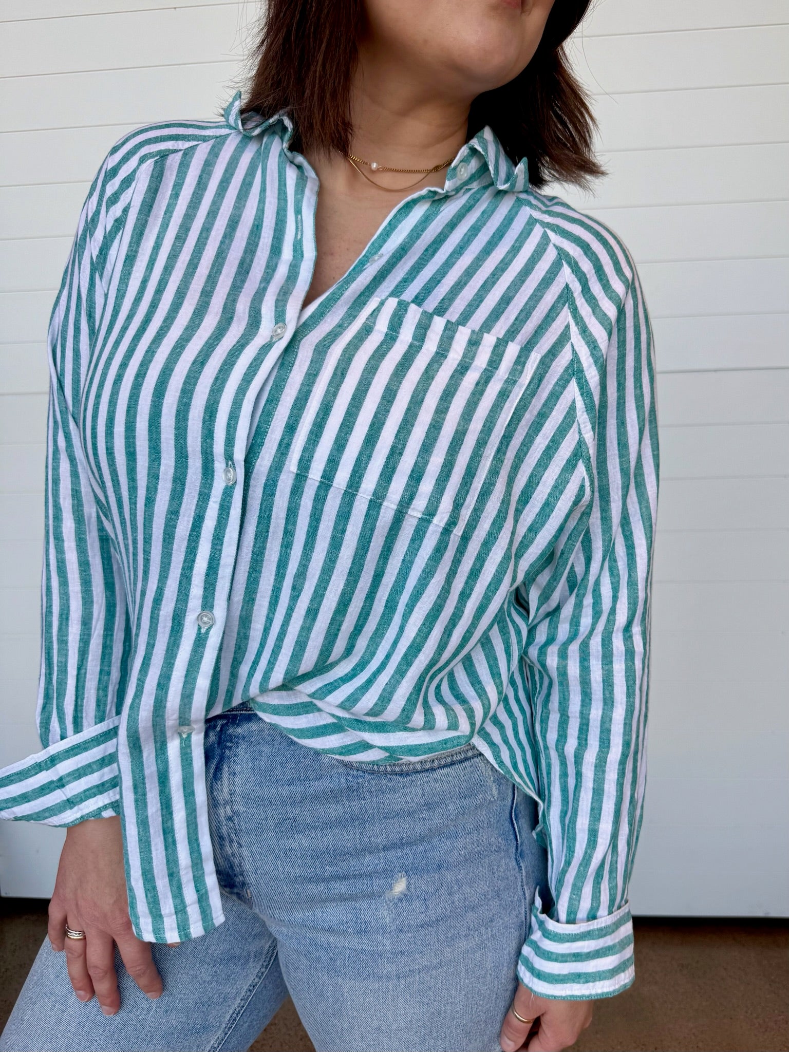You'll love the easy, breezy comfort of the Perfect Line Top from Z Supply. This classic stripe button-up features that soft, drapey feel you look for in a wardrobe staple. With its relaxed fit + lightweight fabric, this top can be worn alone for a polished look or layered over your favorite tank or tee for effortless style. The collared neckline, long sleeves + curved hemline offer a timeless silhouette, while the button front + chest pocket add practical details.