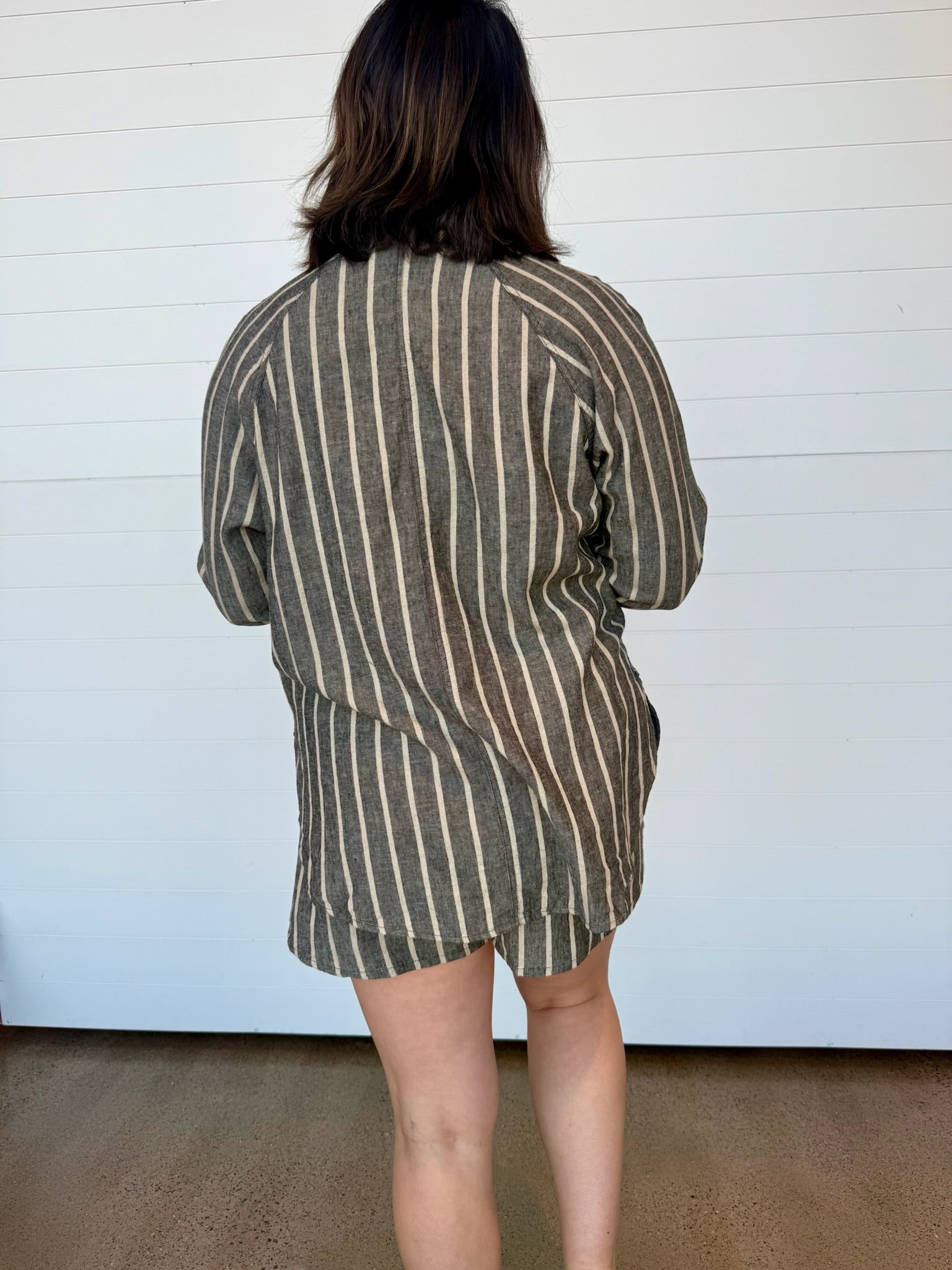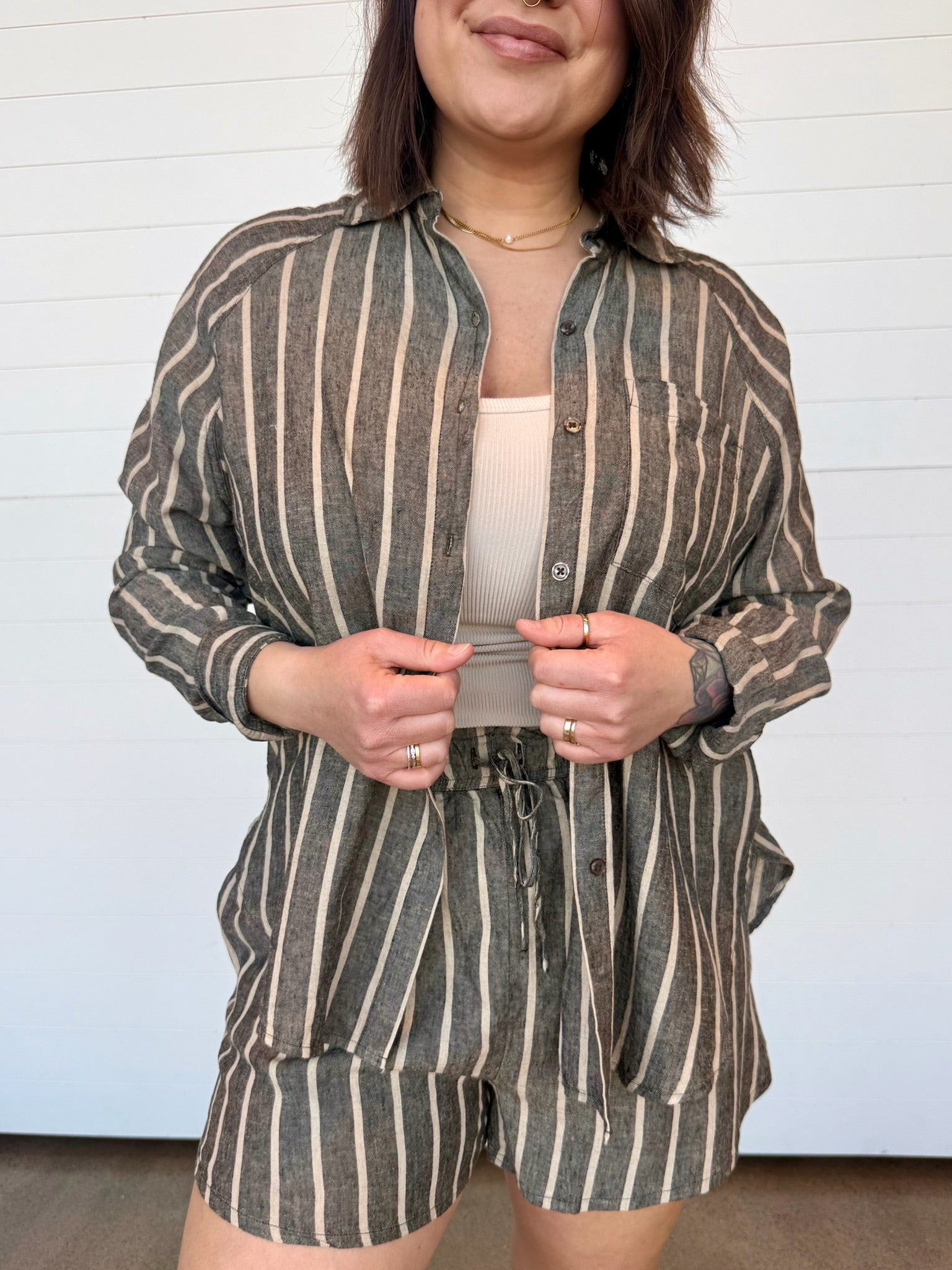 Perfect for any occasion, this top transitions seamlessly from work to play. Pair it with the matching short for a casual day out or dress it up with tailored pants for a chic office look. The neutral color makes it versatile + easy to style with all your wardrobe favorites.