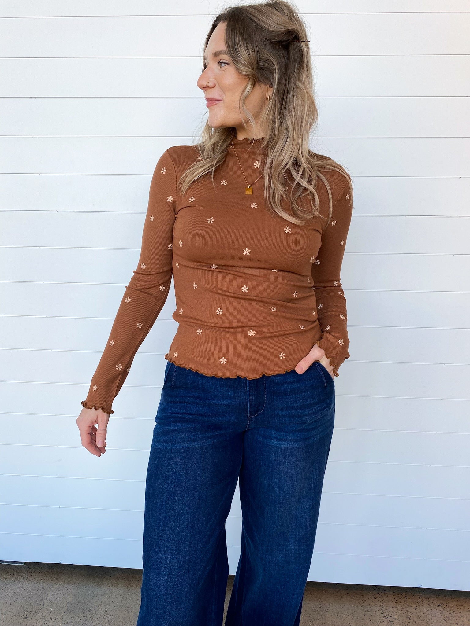 The Micay Flower Embroidered Mock Neck Top – One:Nine Boutique