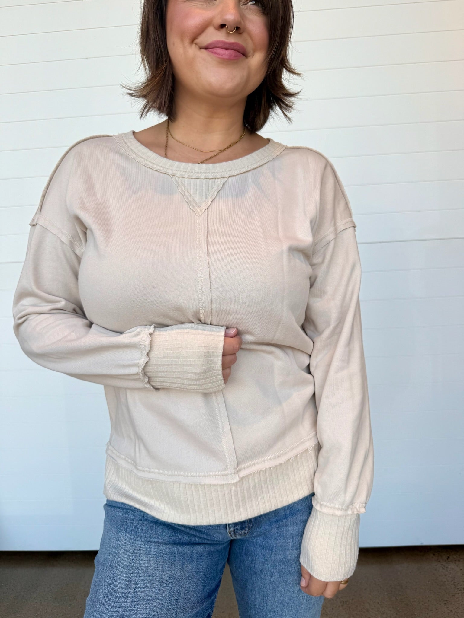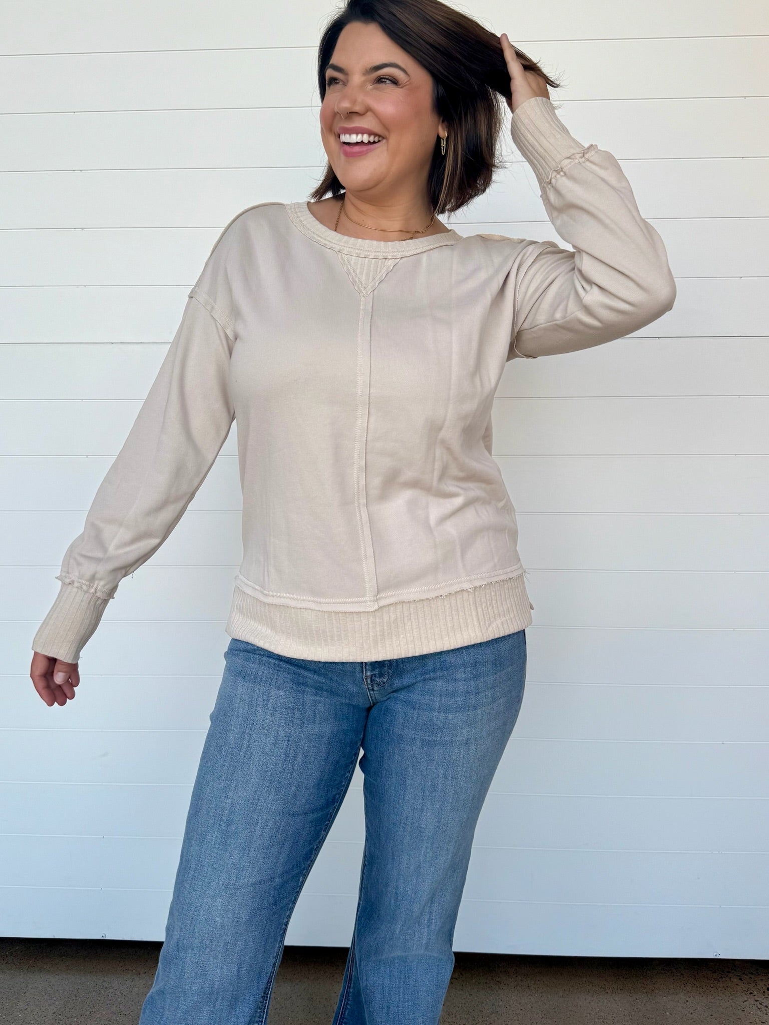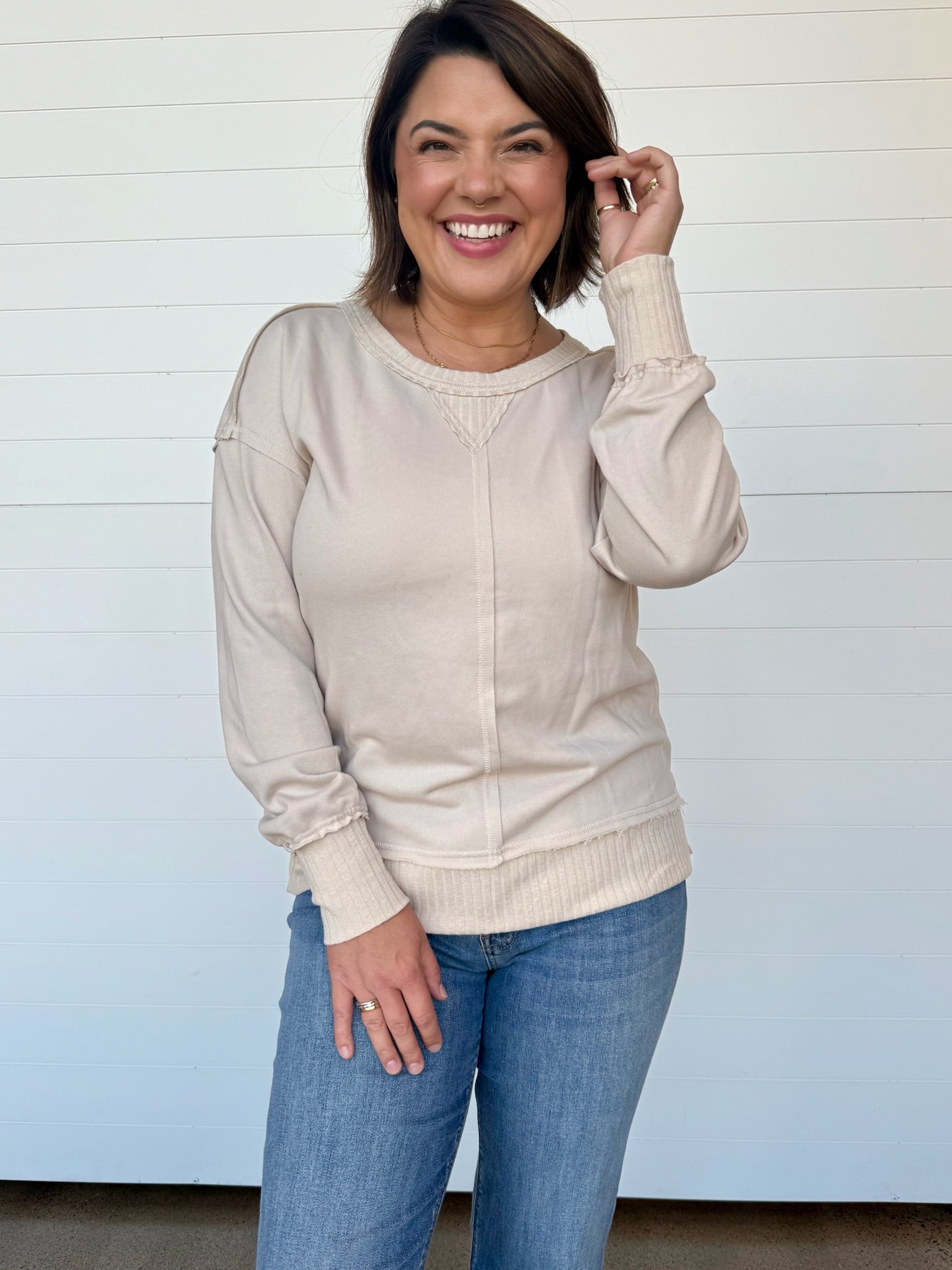 Meet your new everyday essential—the Talia French Terry Pullover. Designed with a relaxed fit + cozy French terry fabric, this pullover blends laid-back comfort with an elevated touch. The raw seam details, ribbed contrast hem, + subtle V-stitch neckline add just the right amount of edge while keeping it effortlessly chic.