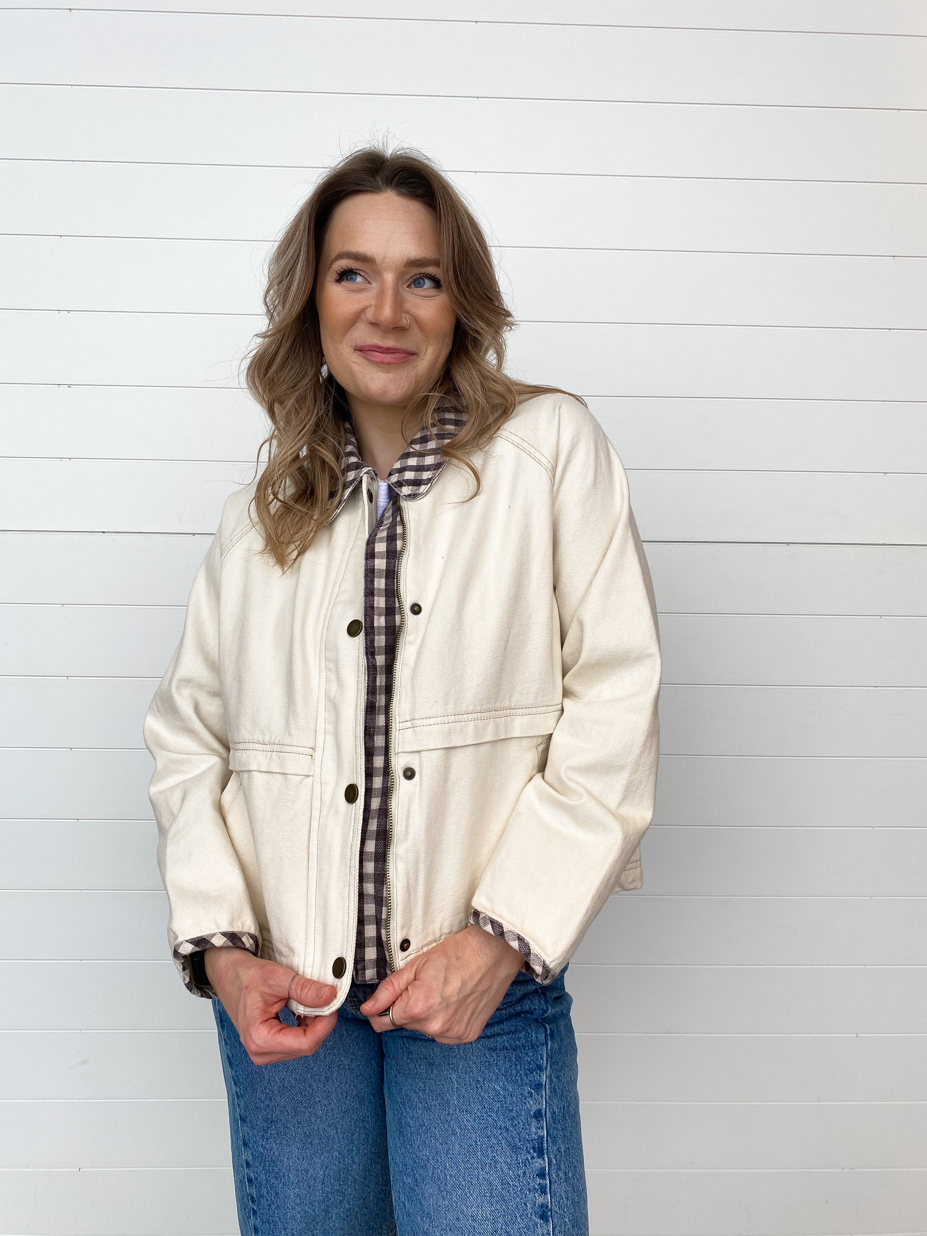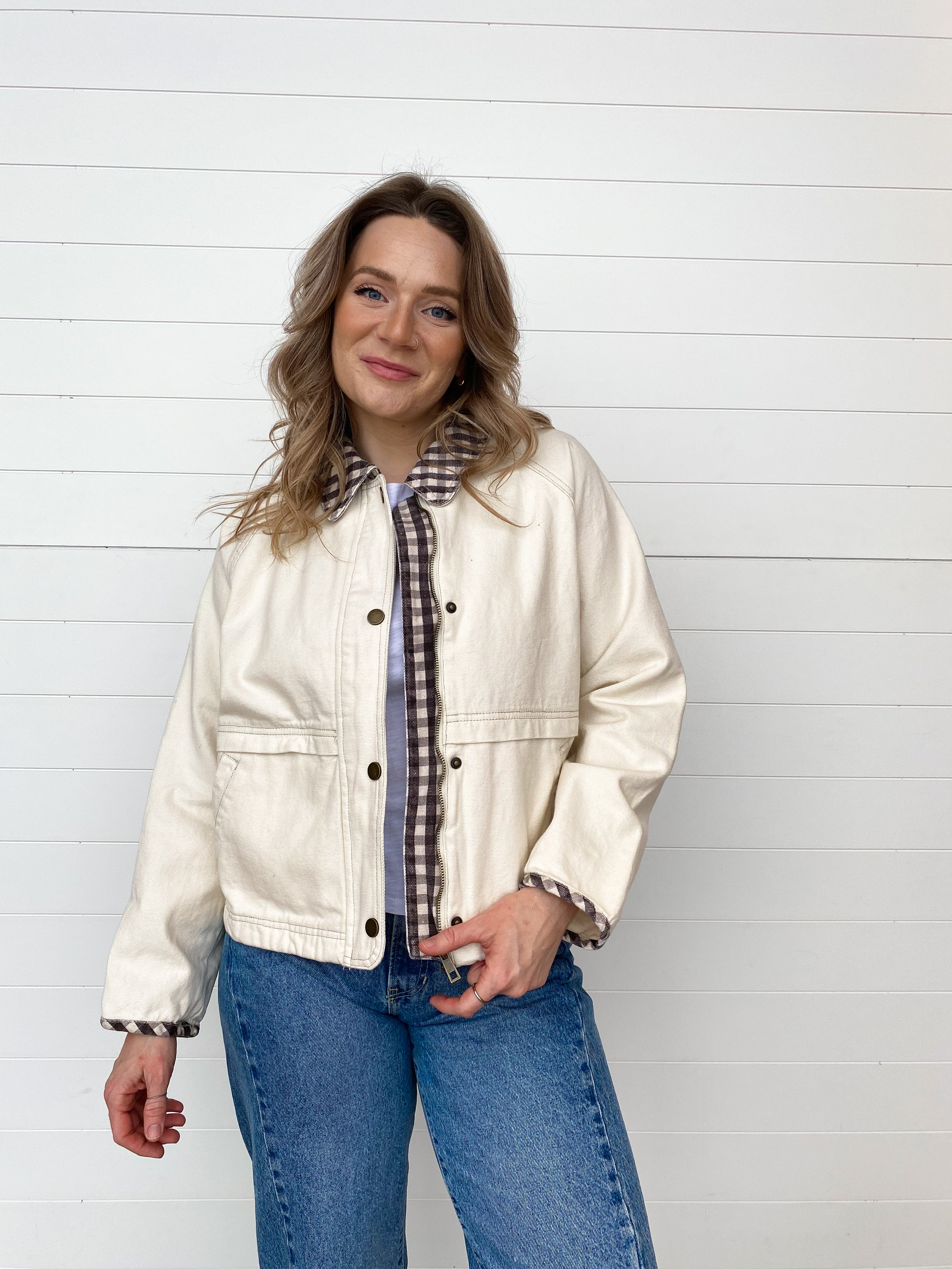 The charming plaid collar + cuff detail adds a playful pop that sets this jacket apart (we love a little unexpected moment!). Snap buttons, front pockets, + that slightly cropped, boxy shape make it the easiest throw-on piece for busy mornings when you still want to look pulled together.