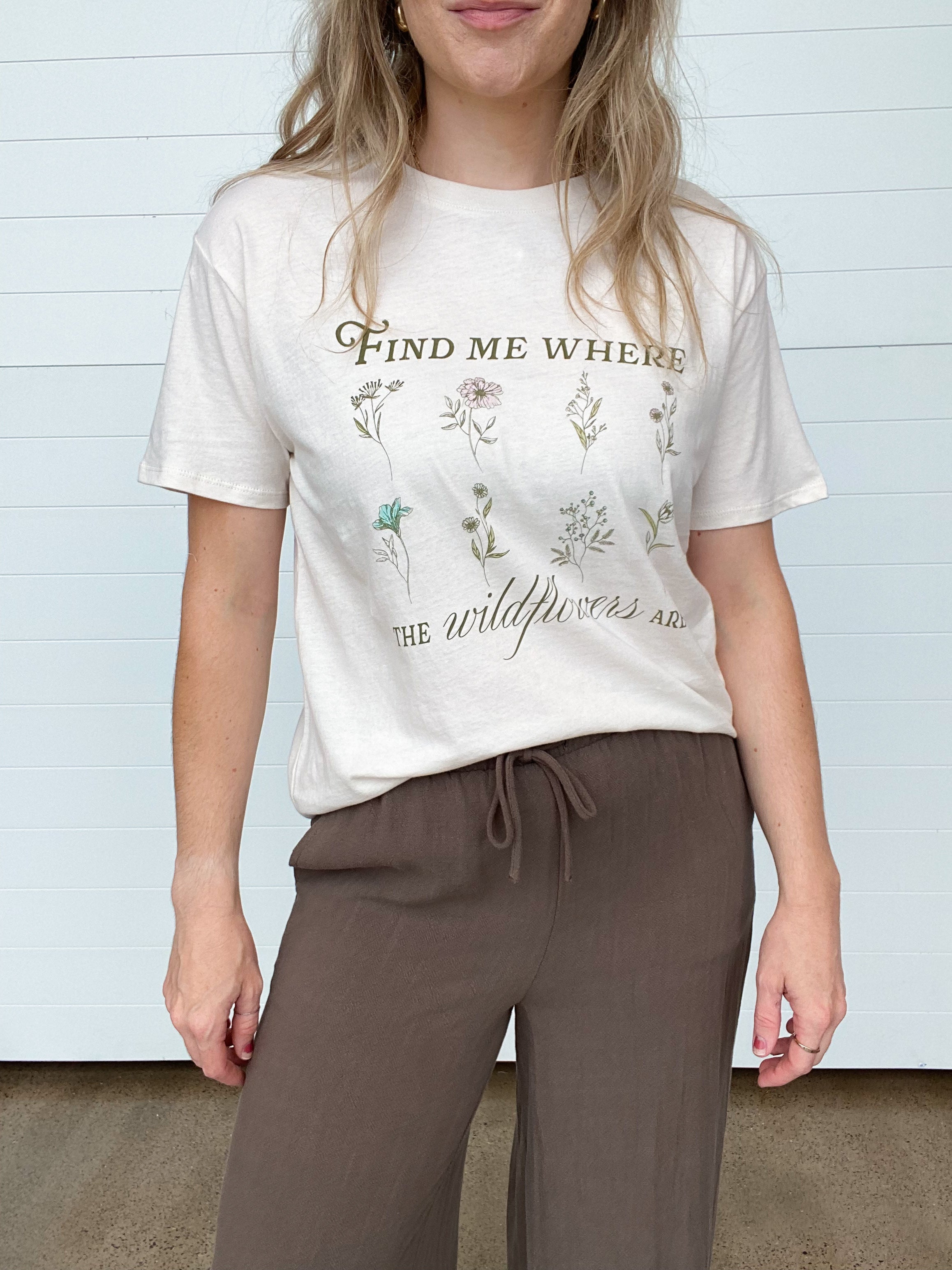 The Boyfriend Wildflowers Tee is the perfect blend of comfort + charm. Designed with an oversized, boyfriend fit, this lightweight graphic tee is easy to throw on for a laid-back, effortless vibe. The neutral tone makes it endlessly versatile, while the wildflower graphic with the phrase "Meet Me Where the Wildflowers Grow" adds a sweet, free-spirited touch.