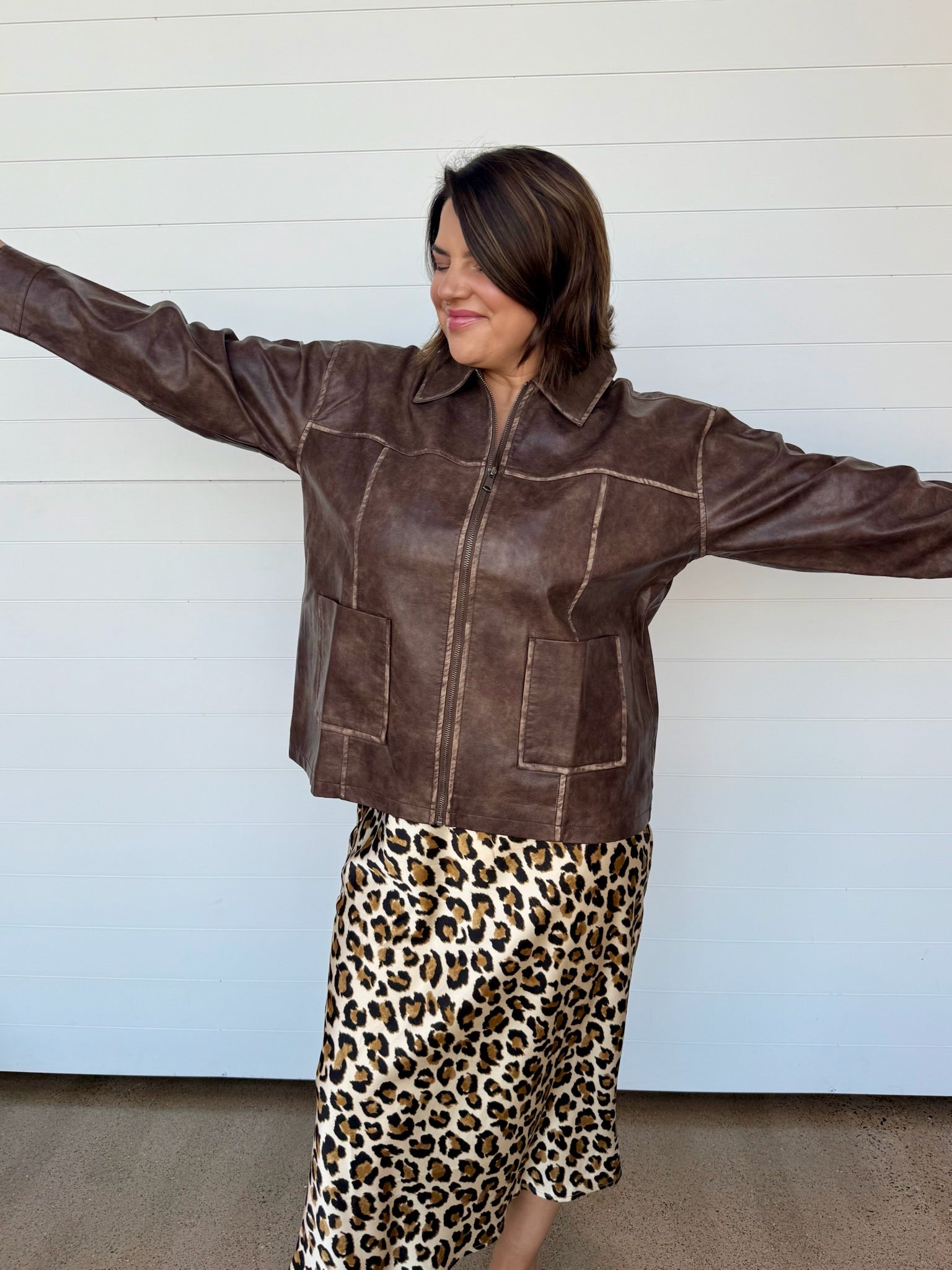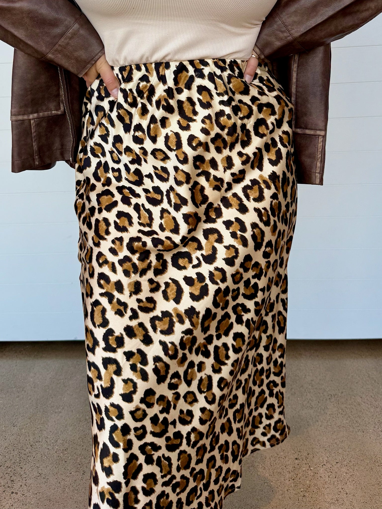 Bring bold + chic energy to your wardrobe with the Audrey Leopard Satin Midi Skirt. This silky satin beauty features a timeless leopard print that’s as versatile as it is statement-making. Cut in a flattering midi length with a fluid drape, it’s the perfect balance of classic and trendy—effortless to dress up or down.