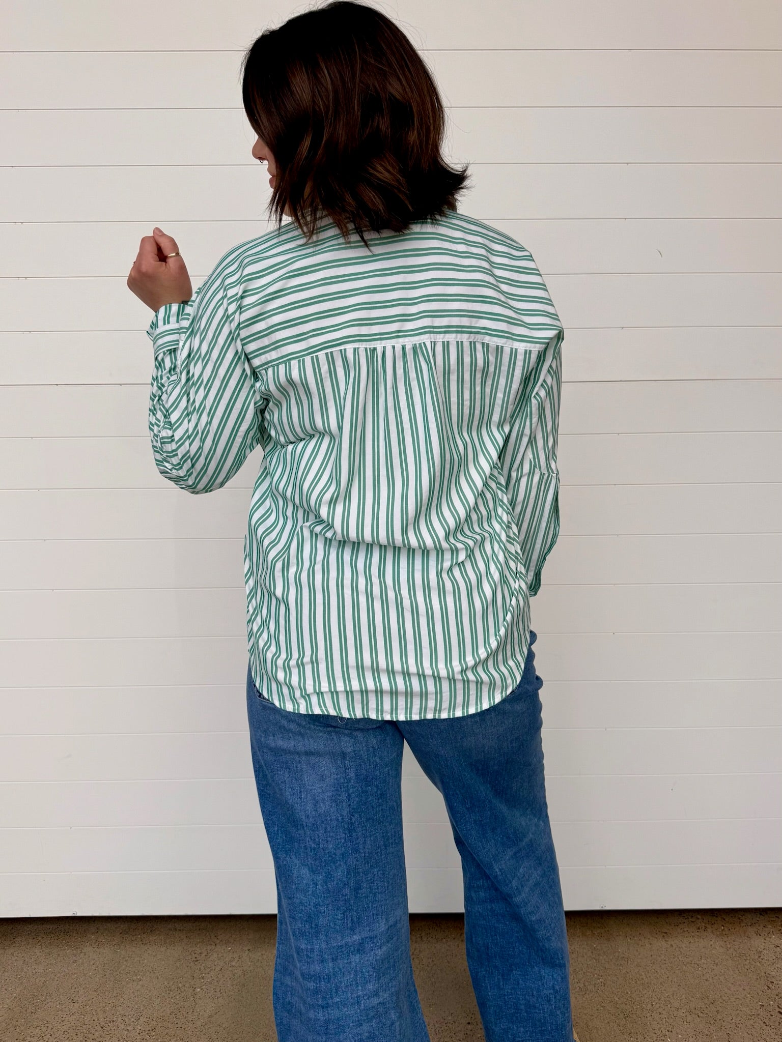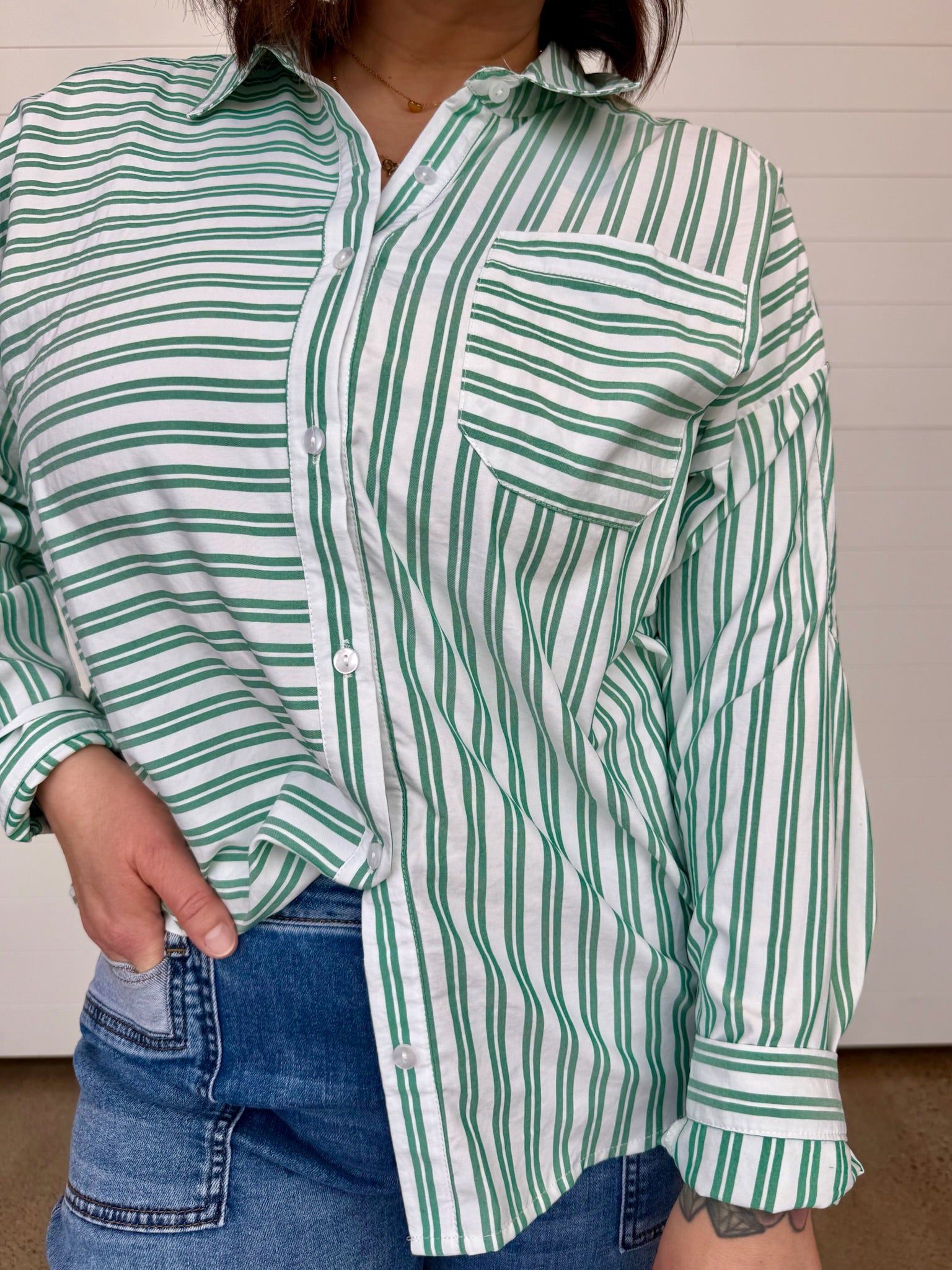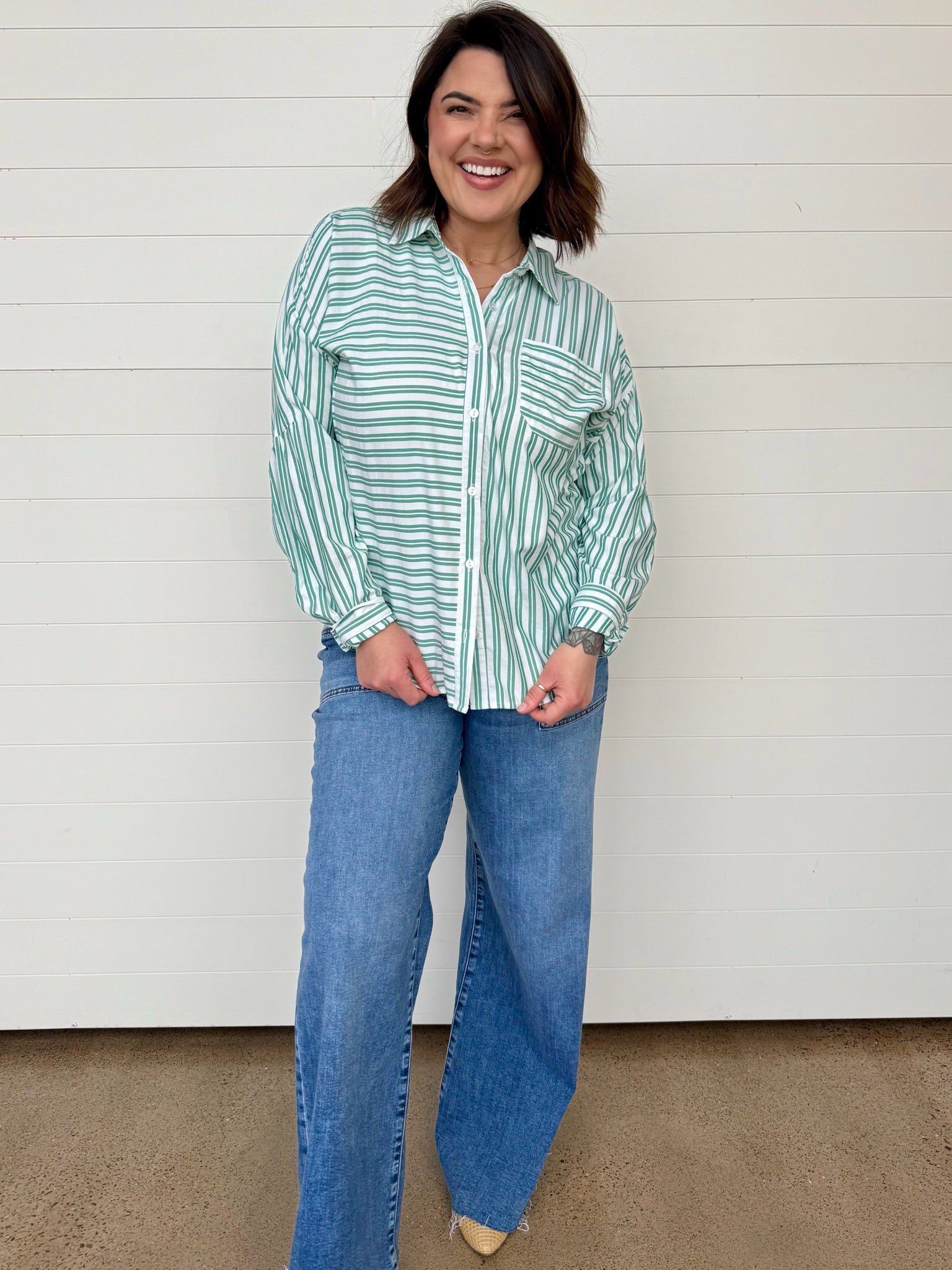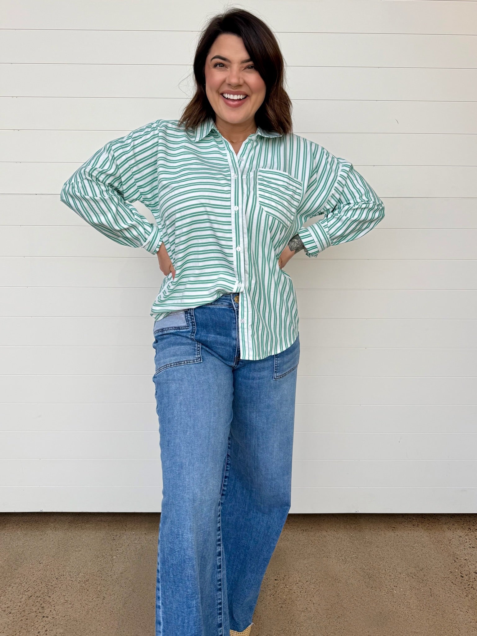The Remy Mixed Stripe Button Up Top is one of those effortless statement pieces that instantly elevates your everyday look. The mix of stripe directions adds just the right amount of visual interest while the oversized fit keeps it relaxed, comfy, + easy to style. It’s the kind of button up you’ll reach for when you want to look put-together without trying too hard.