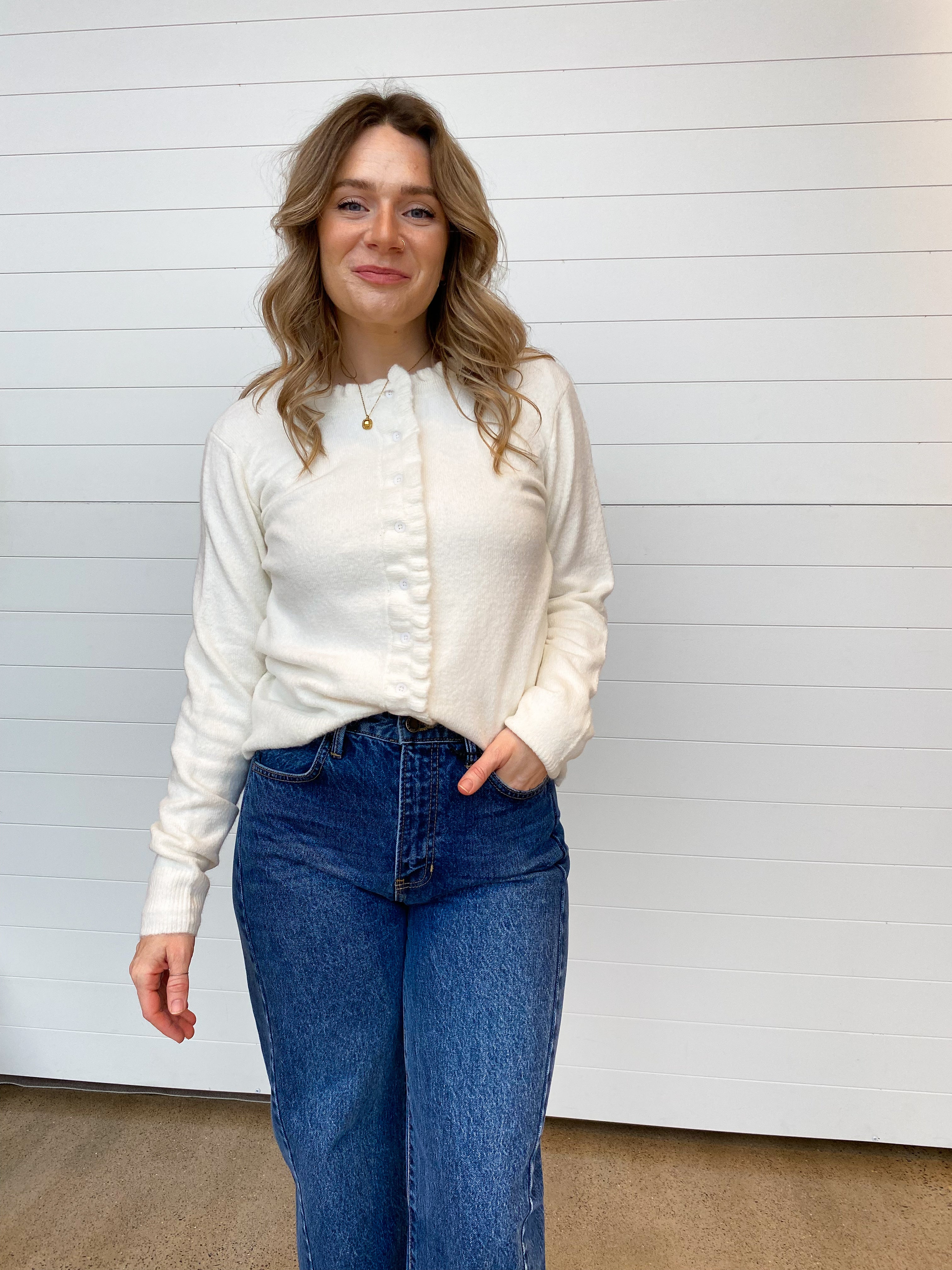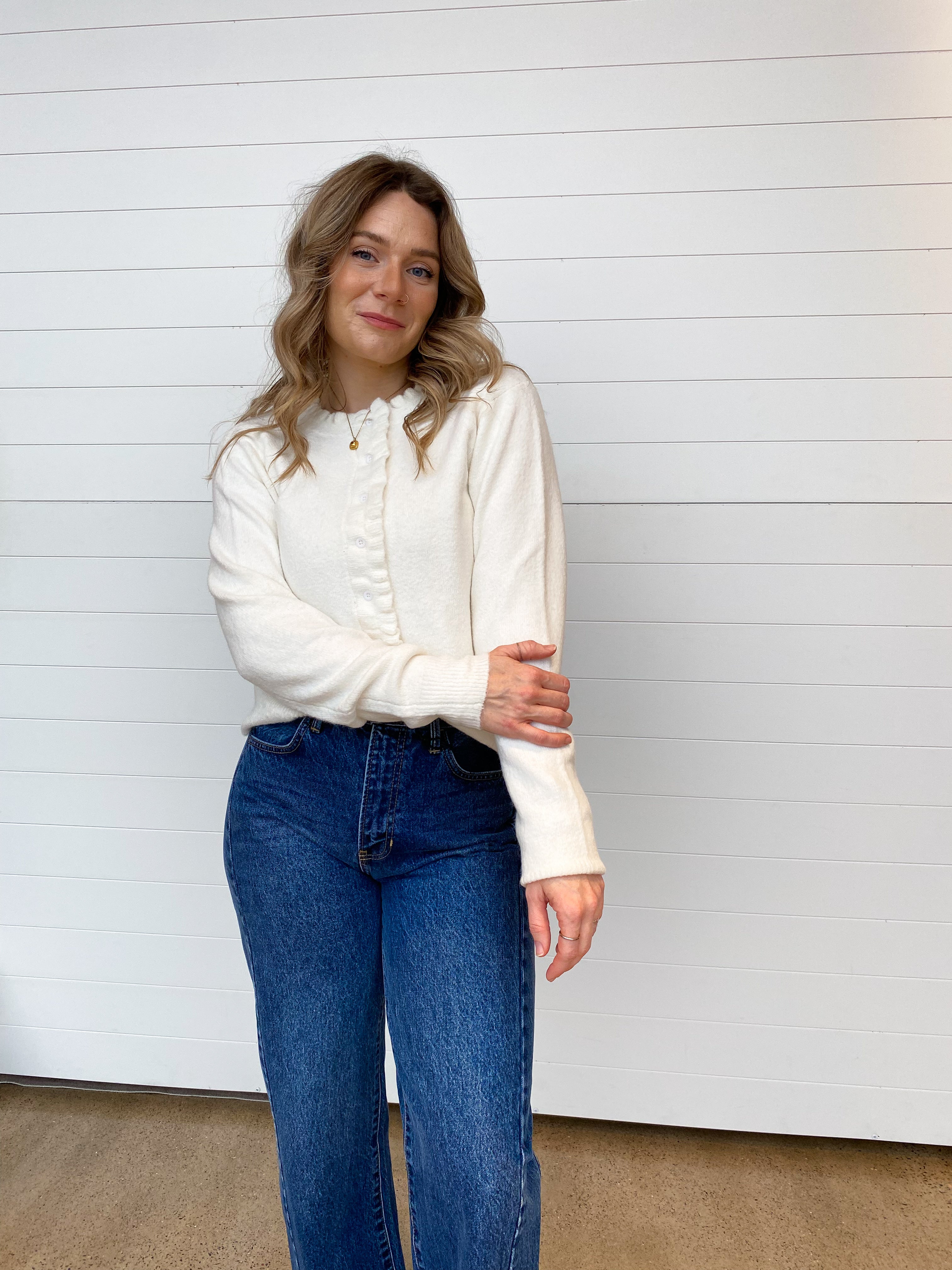 Meet the cardigan that adds a little something sweet to every outfit. The Gianna Ruffle Trim Button Up Sweater is a feminine, everyday layer with the softest silhouette + the prettiest ruffle detailing along the neckline + button placket. It’s classic, polished + just the right amount of playful—your new go-to for dressing up denim, layering over basics or adding charm to your work-to-weekend wardrobe.