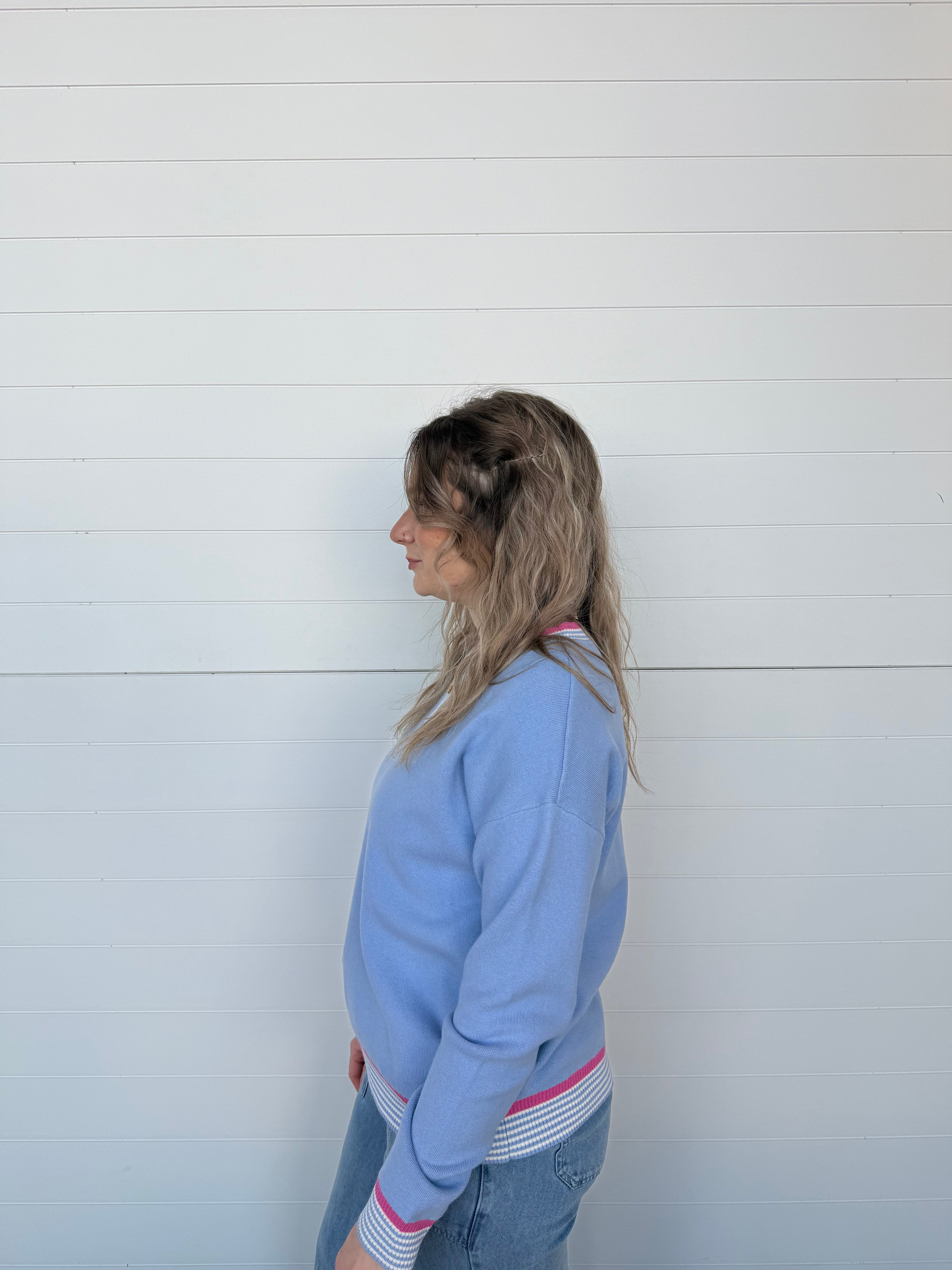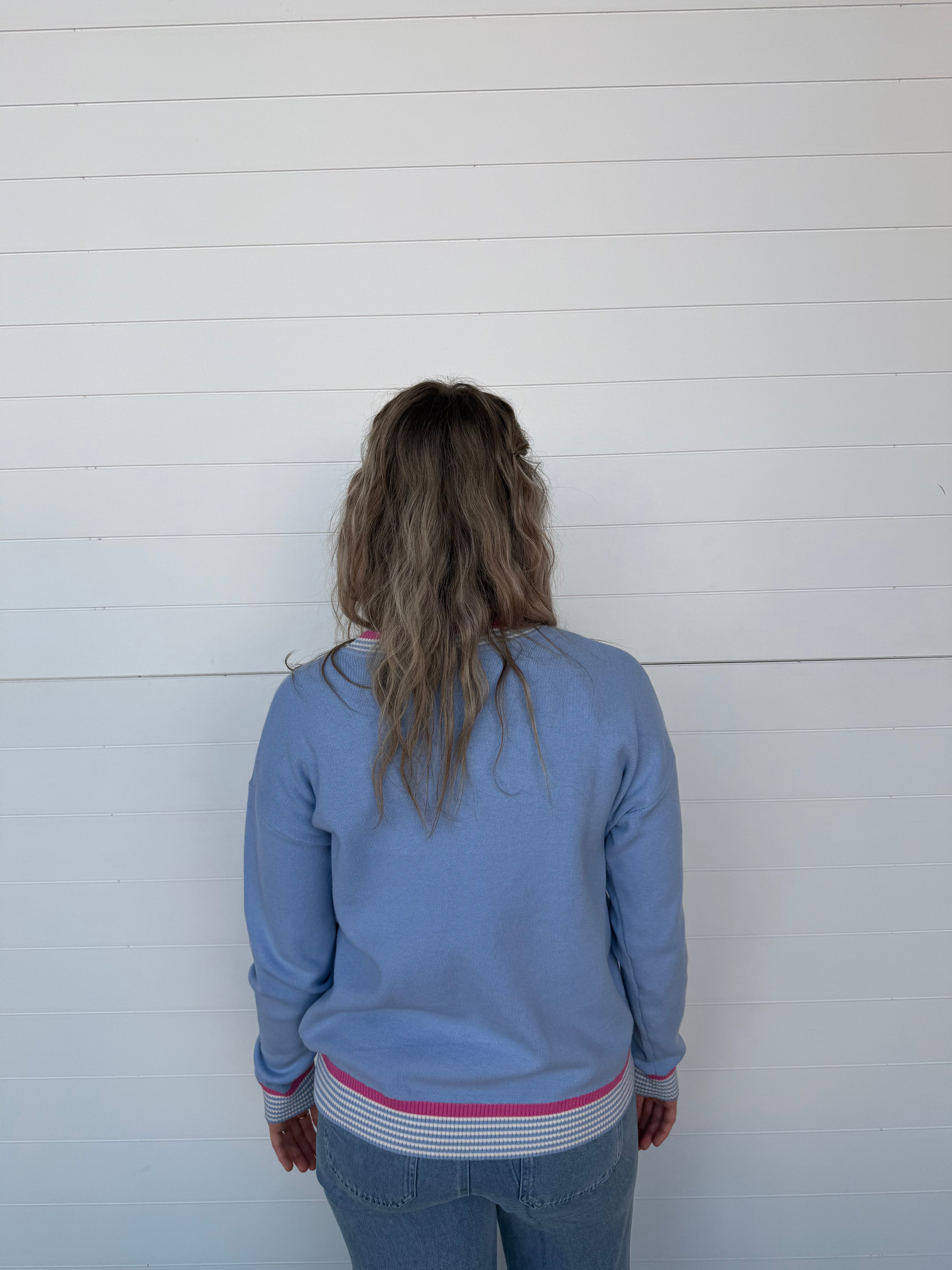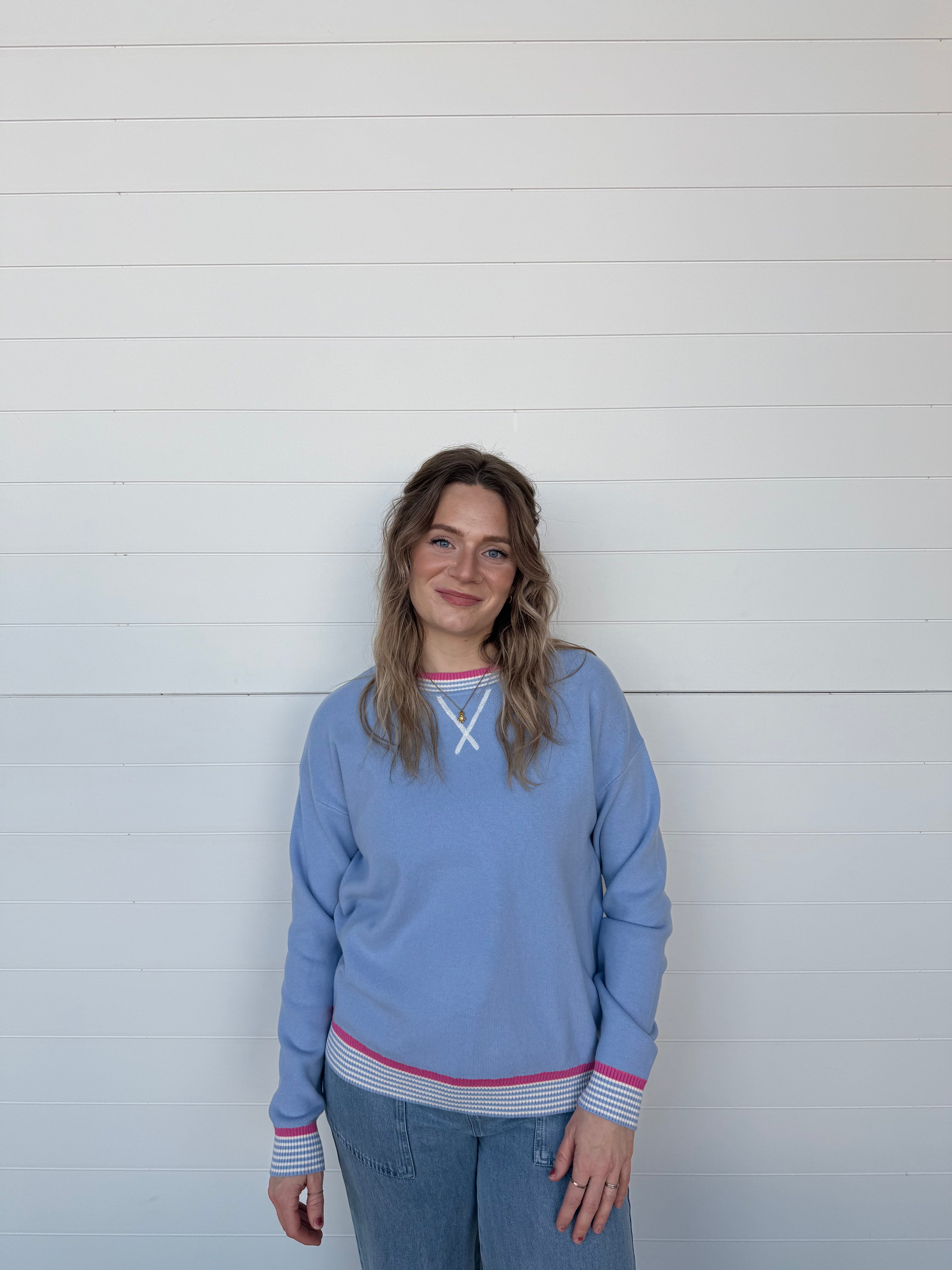 Sporty meets sweet in the Savannah Varsity Trim Crewneck Sweater. This everyday favorite features a classic crew neckline, relaxed-but-polished fit, + playful varsity-inspired trim details that give it a fresh, fun vibe. The contrast ribbing at the neckline, cuffs, + hem adds just the right pop while keeping the overall look easy + wearable.