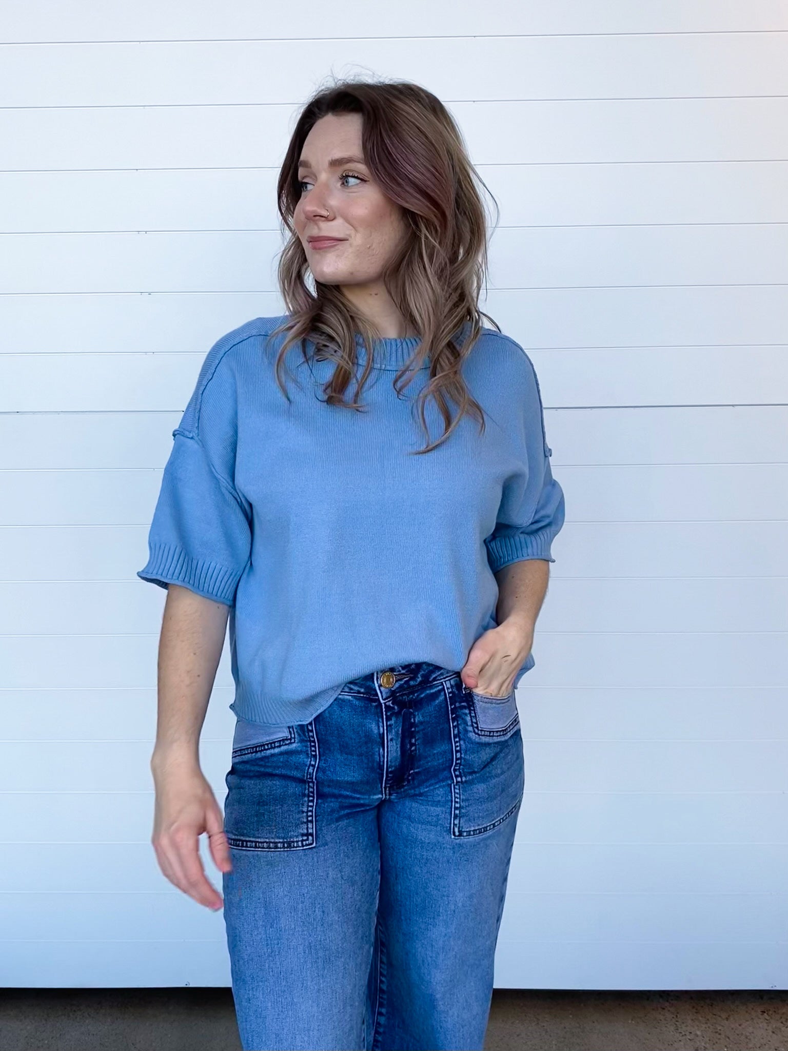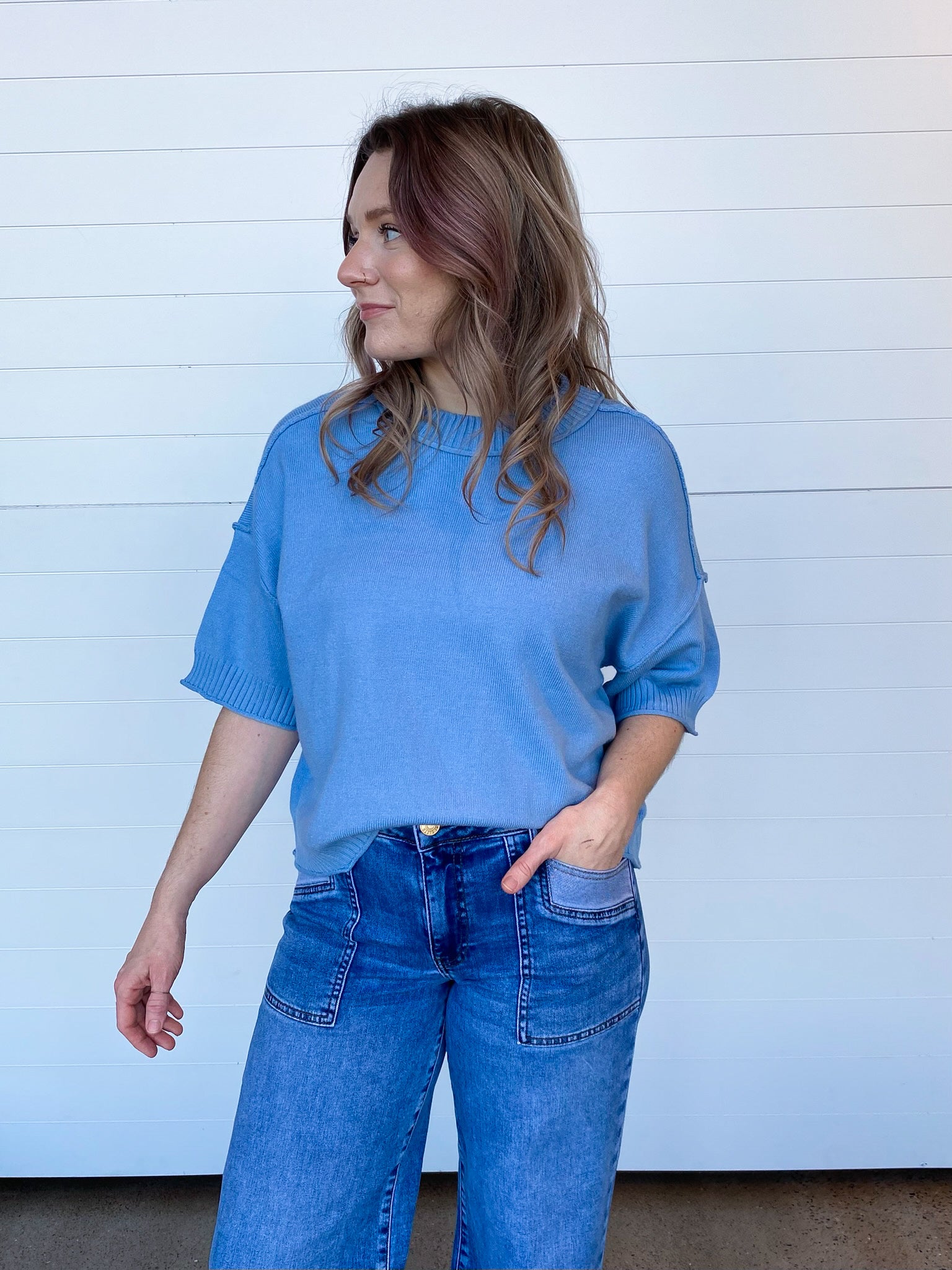 Meet the short sleeve sweater that’s about to steal the spotlight in your spring-to-fall lineup. The Isla Exposed Seam Short Sleeve Sweater is soft, drapey + effortlessly cool — the kind of knit you throw on once + instantly wonder how you ever lived without it.