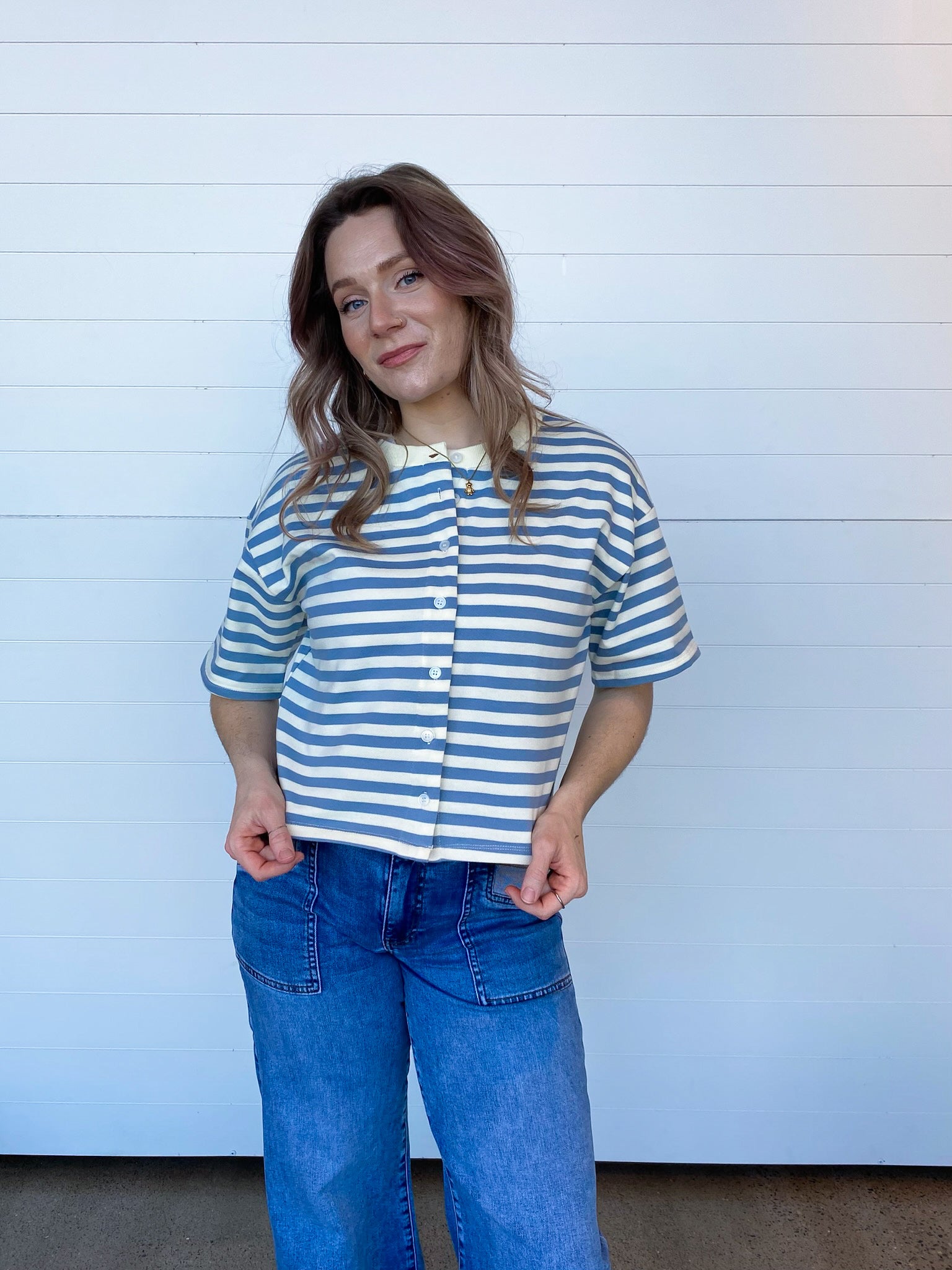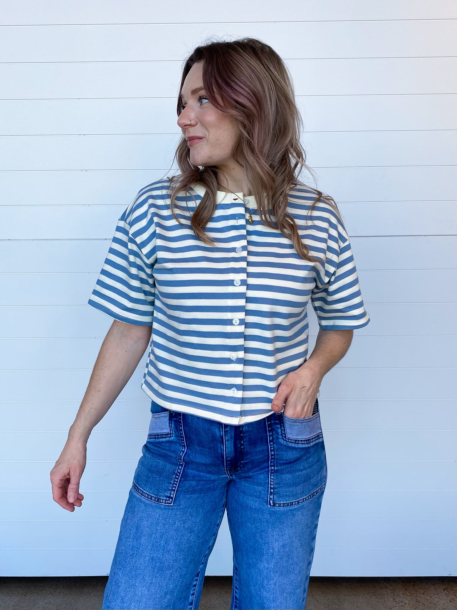The button-front detail adds a sweet, cardigan-inspired touch, while the short sleeves keep things cool + comfy. Whether you're pairing it with denim shorts for weekend errands, tucking it into trousers for the office, or layering it over a tank on breezy evenings, Penelope nails that cute-but-casual vibe every single time.