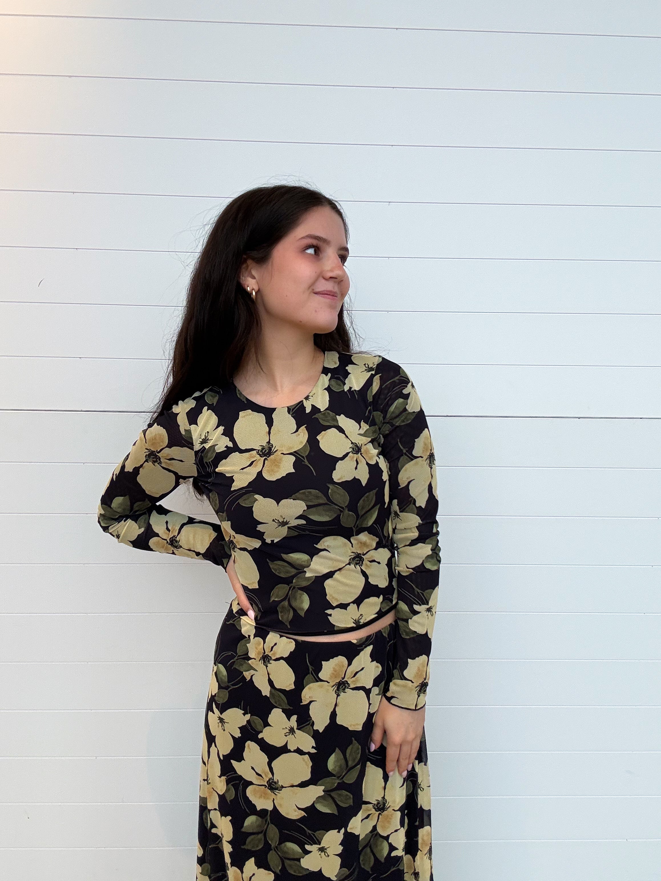 Styling with the matching Eda Ren Floral Mesh Maxi Skirt for a complete set moment