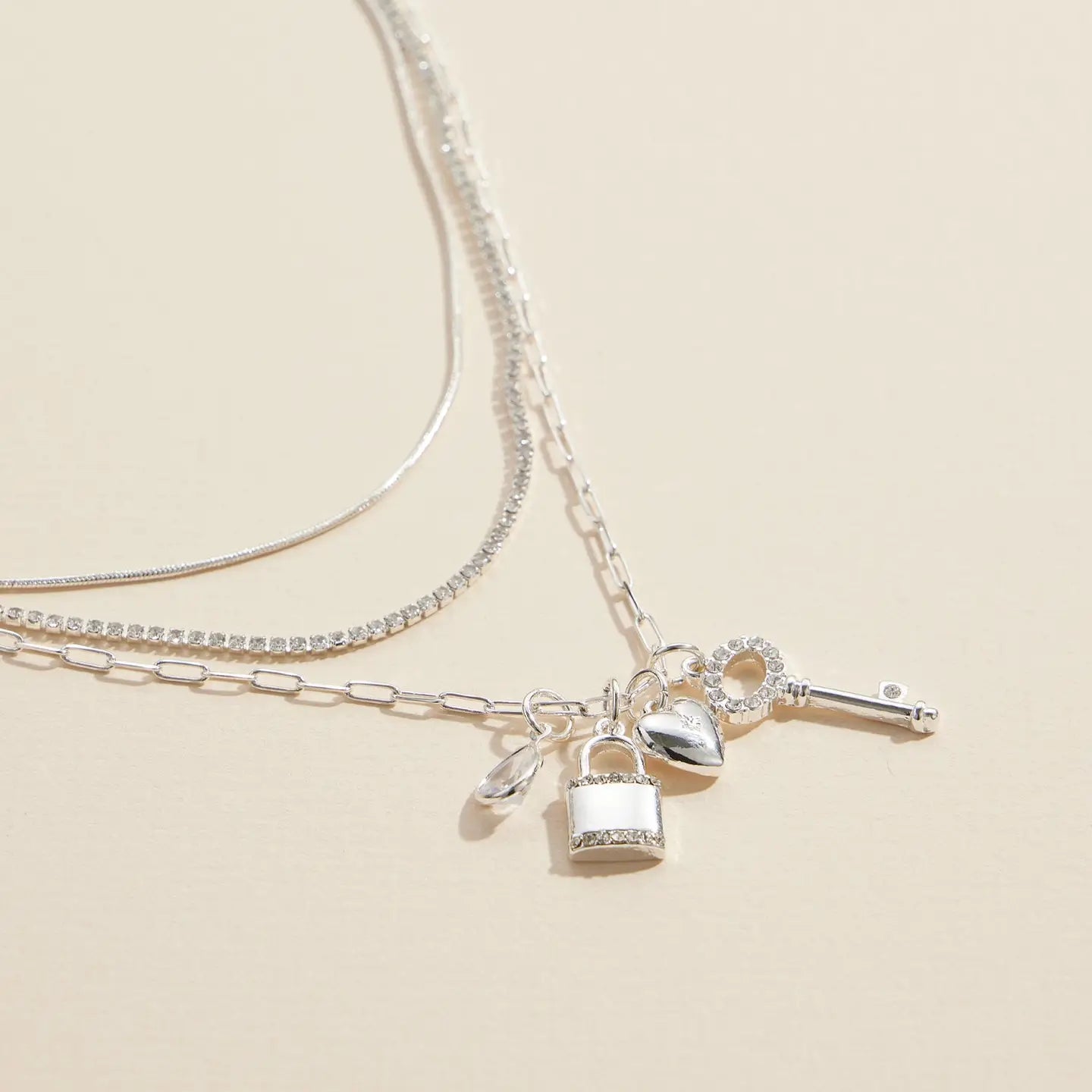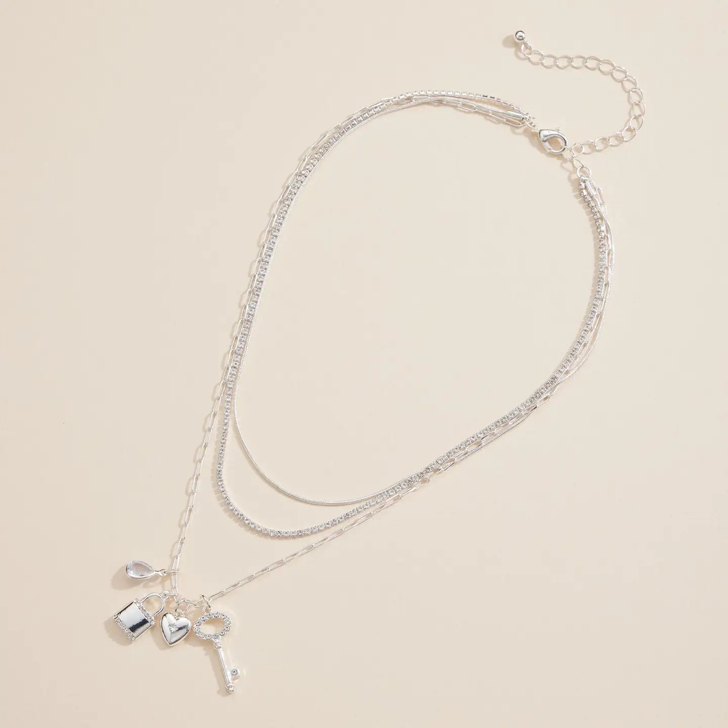 Layered, luminous + effortlessly chic — the Claire Layered Charm Necklace takes the guesswork out of styling. Designed with three tiers of silver-toned chains, this necklace features a delicate mix of modern charms including a key, lock, heart + teardrop gem. It’s that perfect balance of edgy + feminine, making it a go-to accessory for elevating your everyday look.