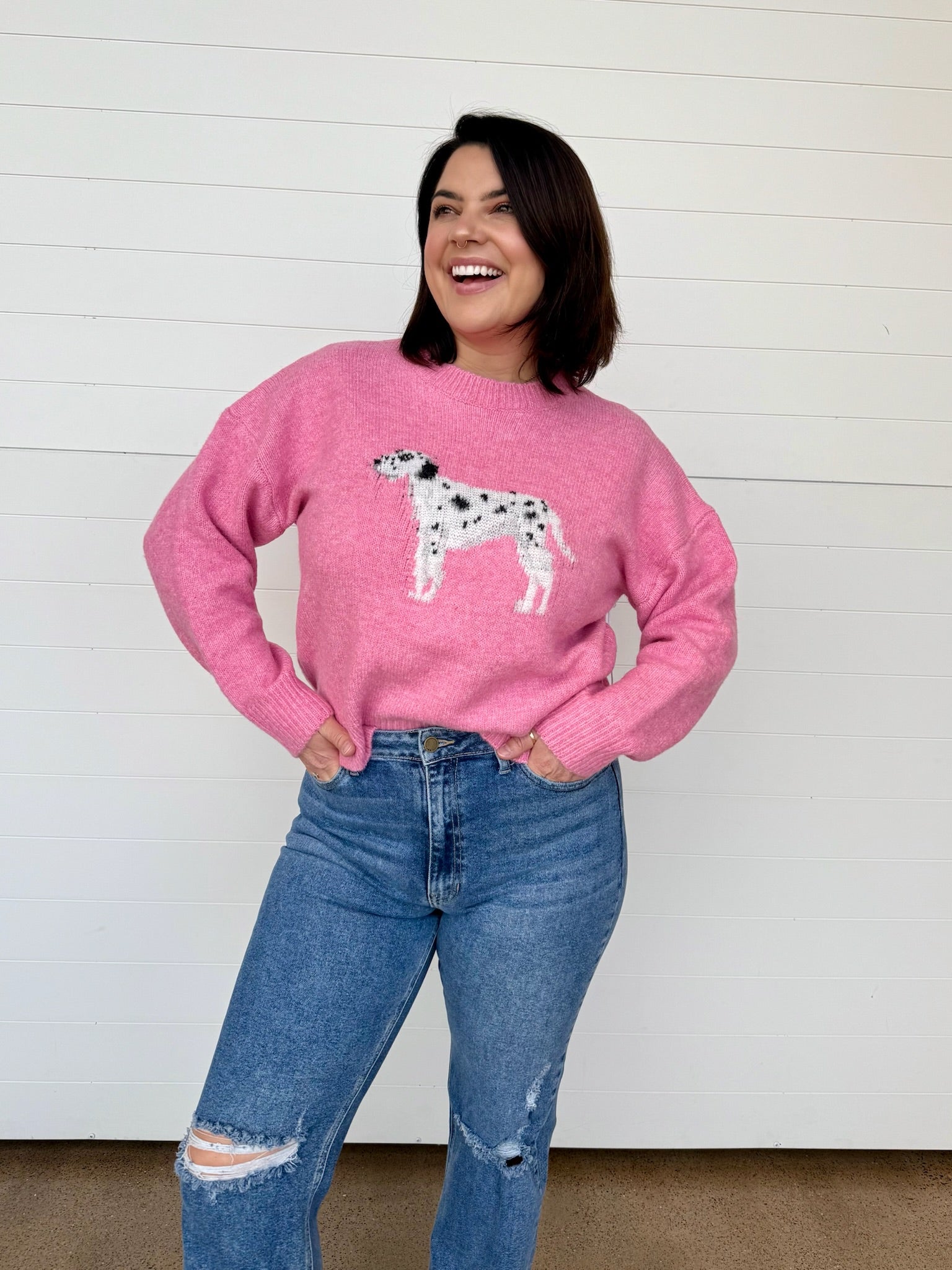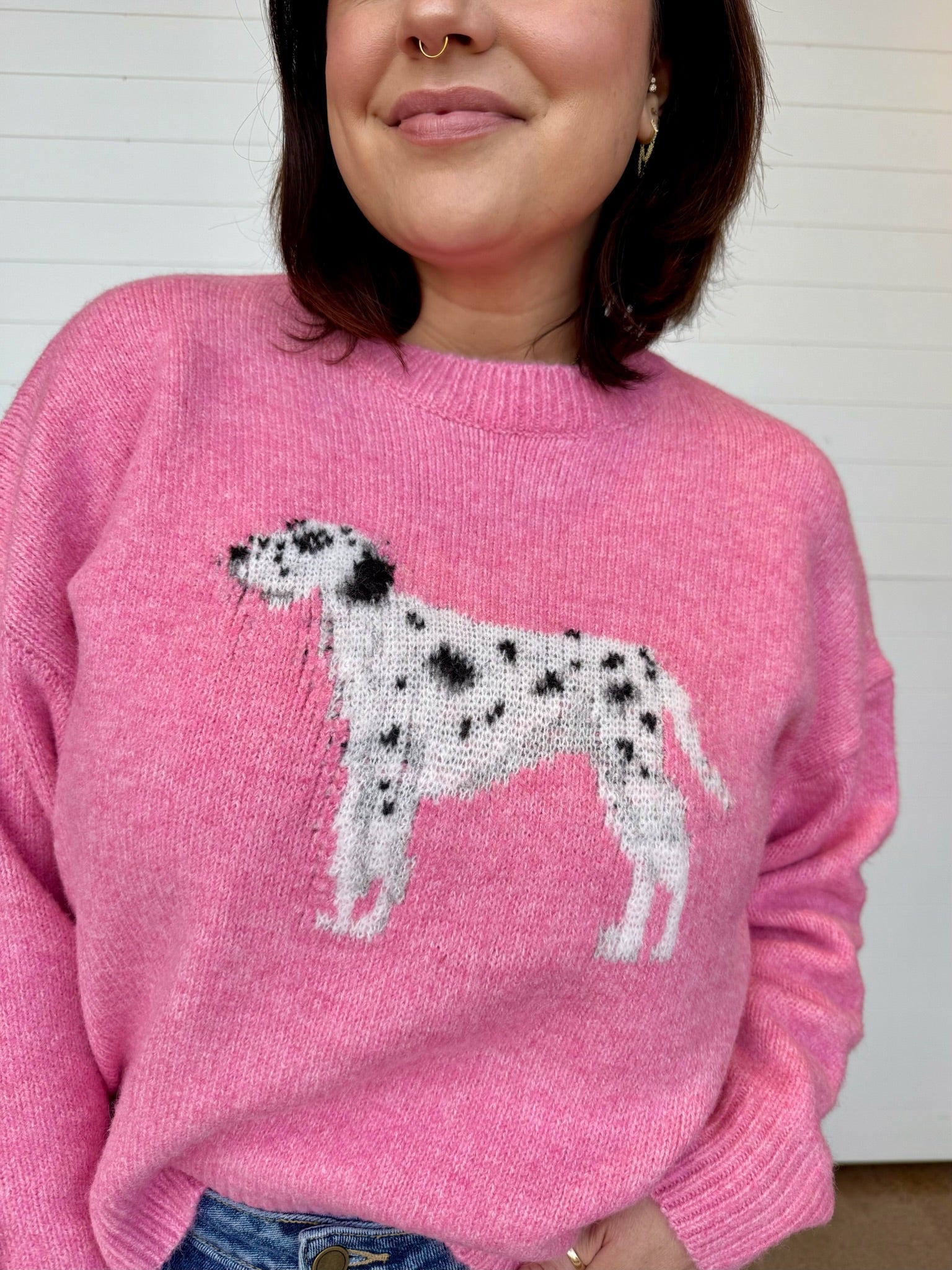 If cozy had a cute factor, this would be it! The Allie Dalmatian Fuzzy Sweater is soft, fuzzy + full of playful personality. A fuzzy dalmatian graphic steals the show to create a feel-good piece that’s comfortable + anything BUT basic. It’s comfy, a little quirky + perfect for adding something fun to your everyday rotation.