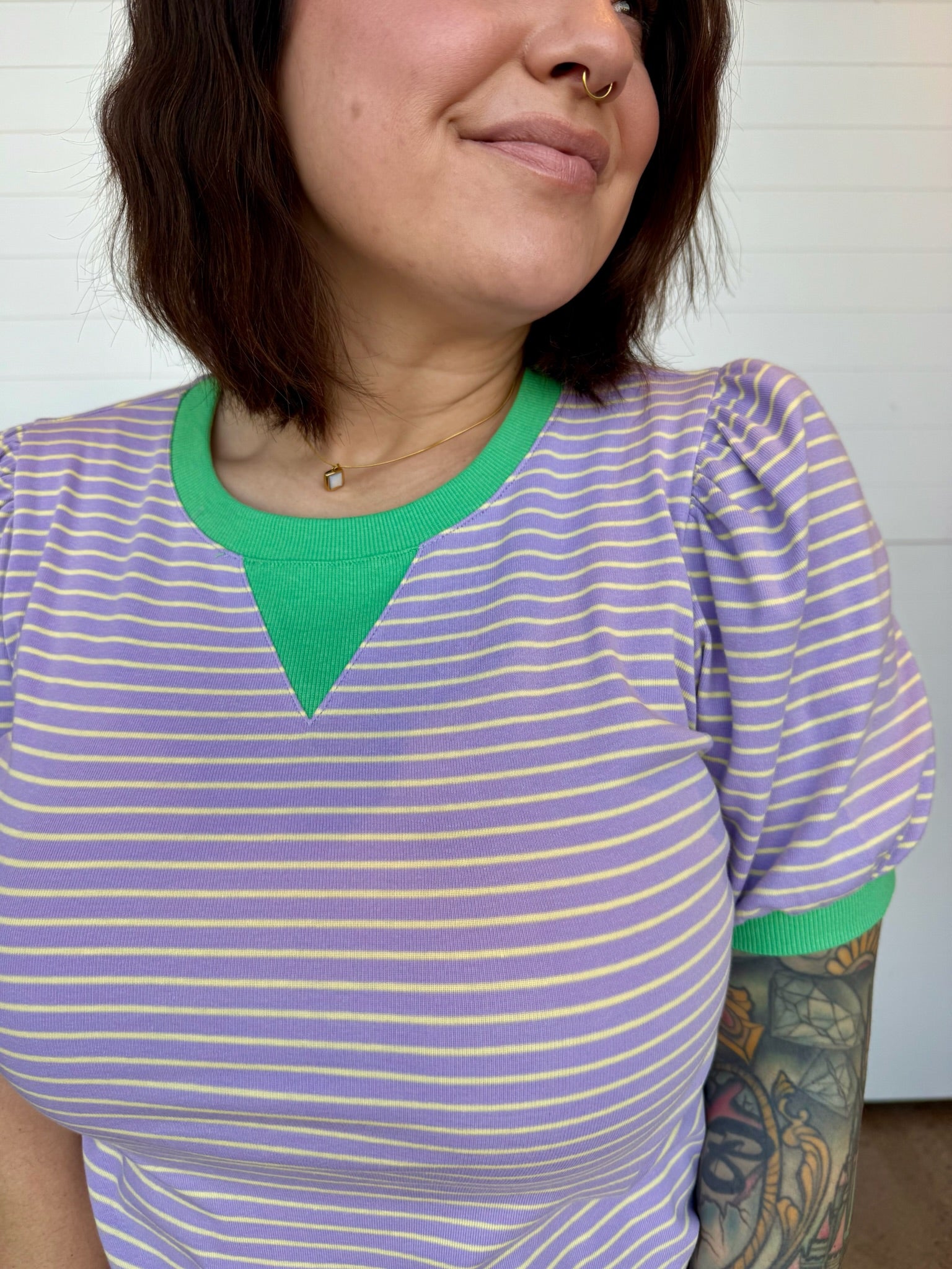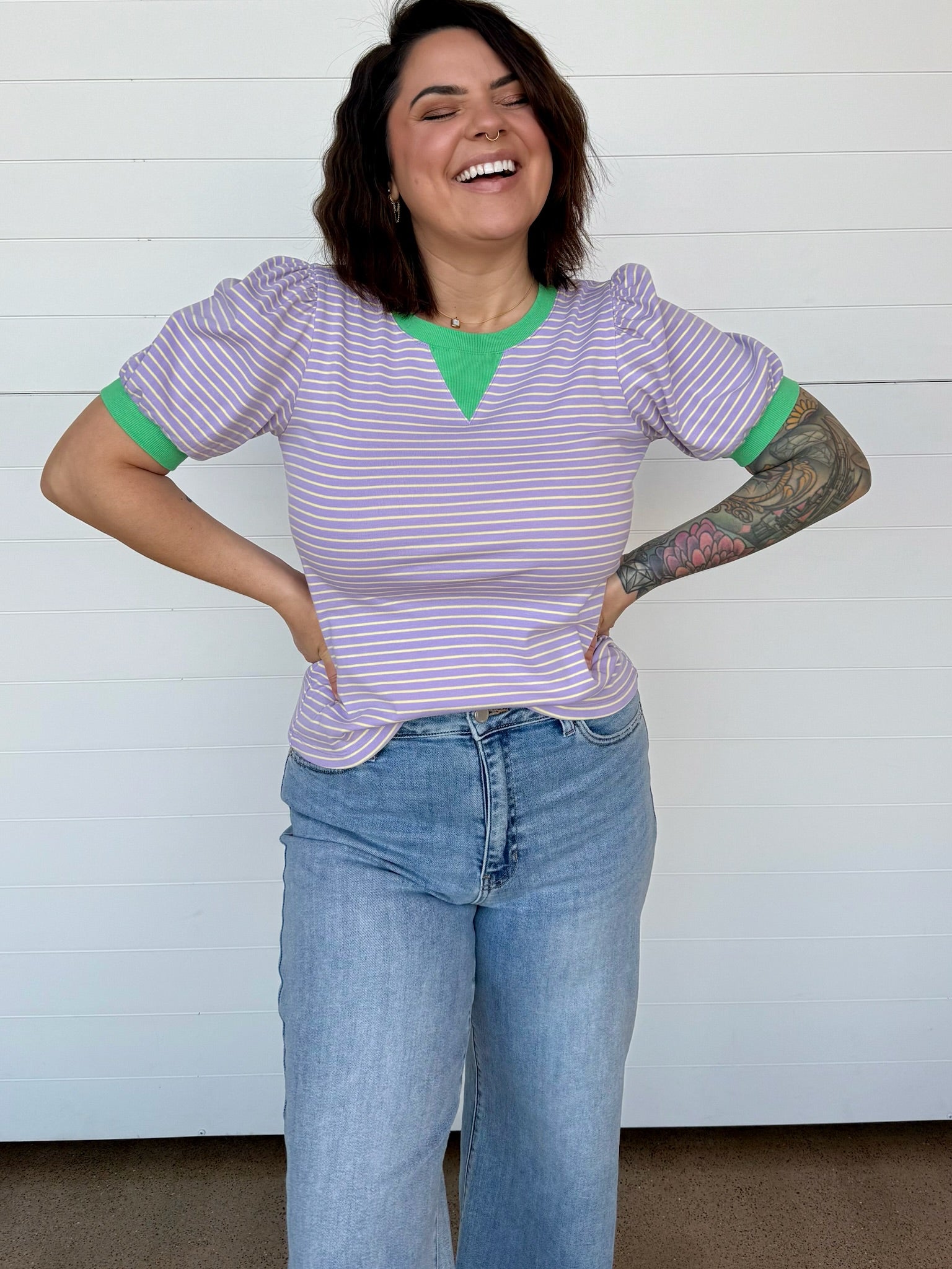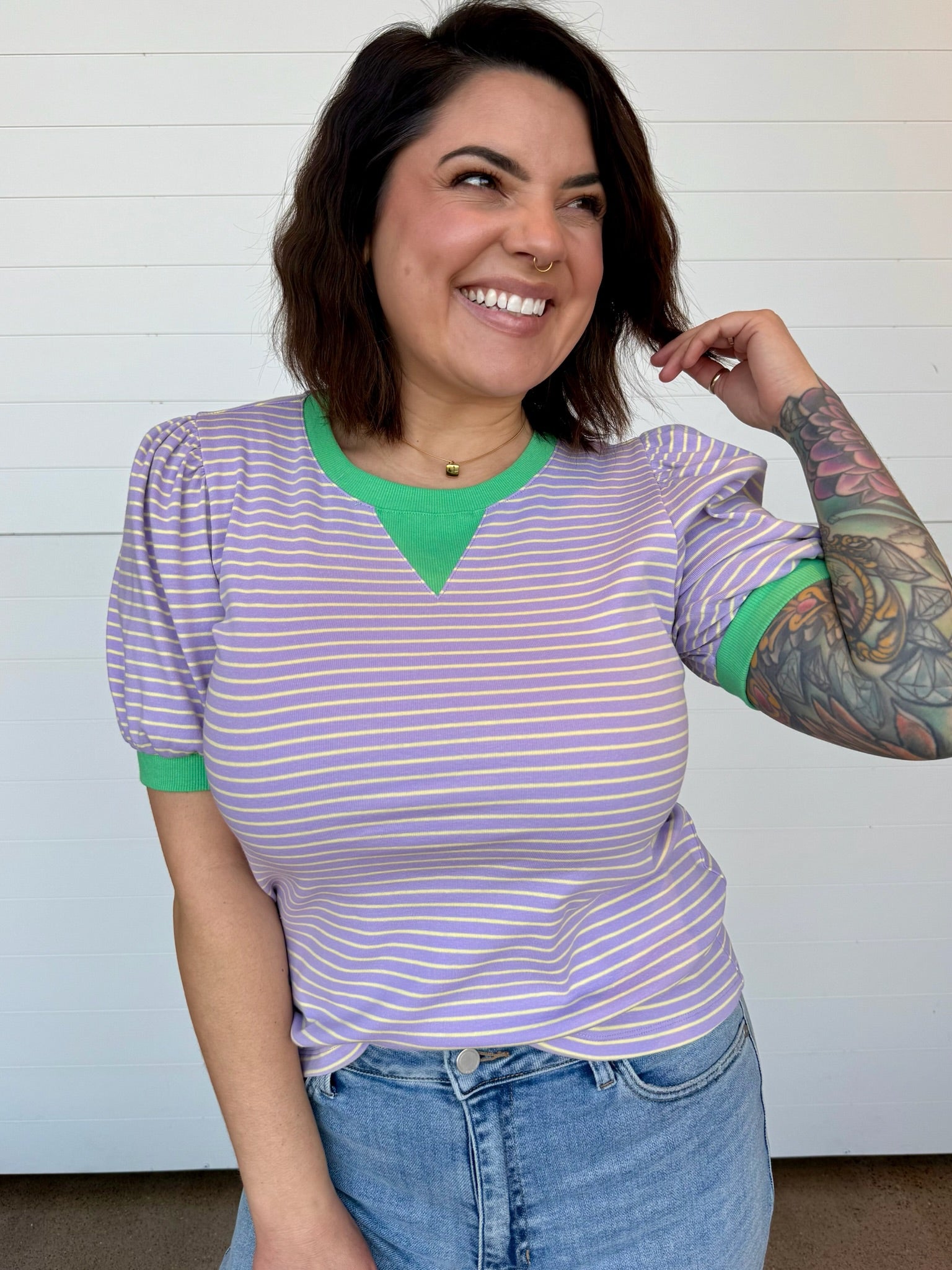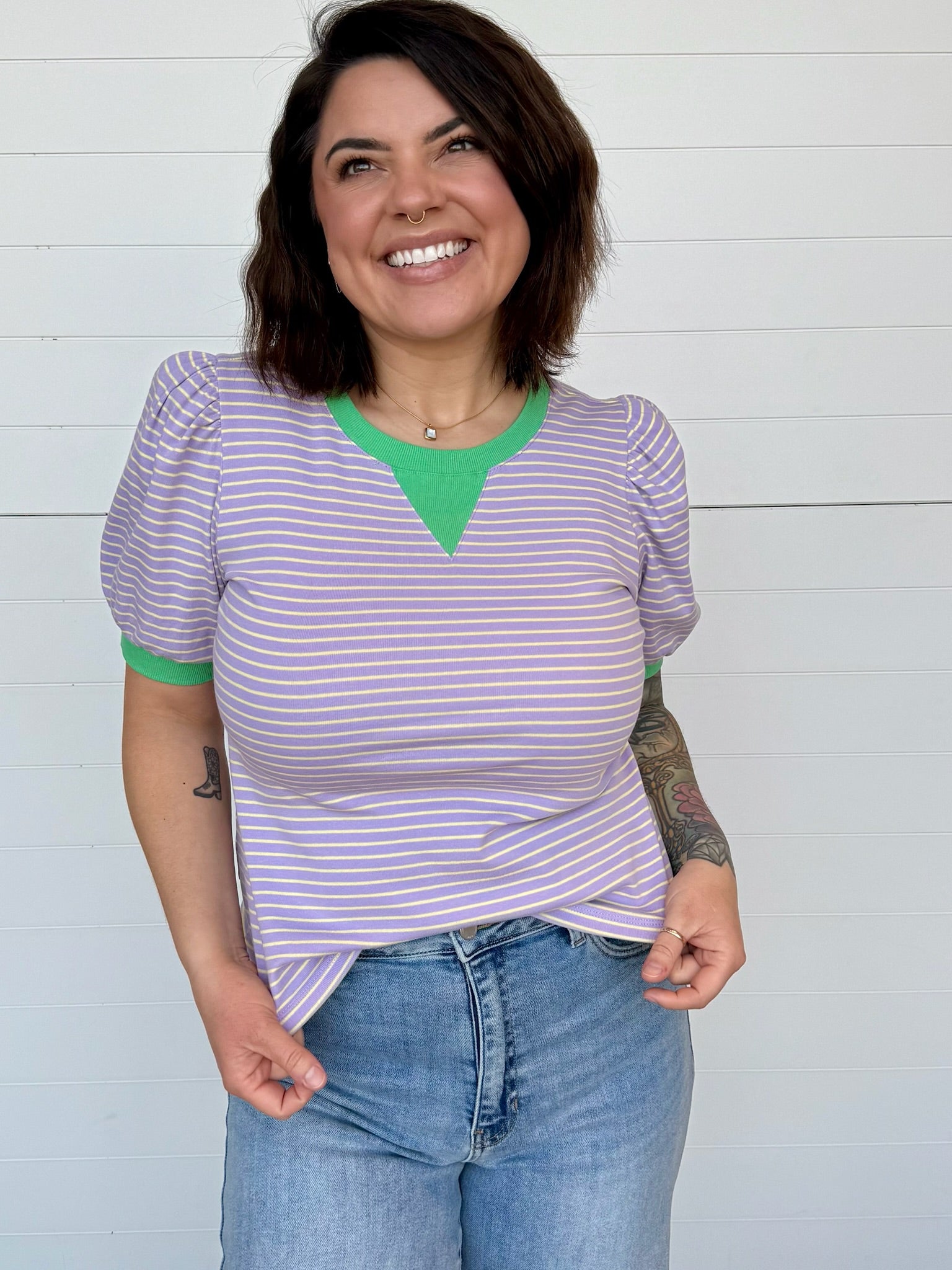 Playful, flattering, + just the right touch of bold—the Camila Half Puff Sleeve Striped Top is here to brighten your everyday lineup. This easy, relaxed-fit tee features crisp lavender stripes paired with a pop of vibrant green at the neckline + cuffs for a fun color contrast that totally stands out (in the best way).