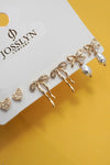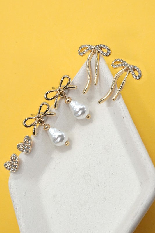 Includes 3 versatile pairs: rhinestone studs, bow studs + bow + pearl drop earrings