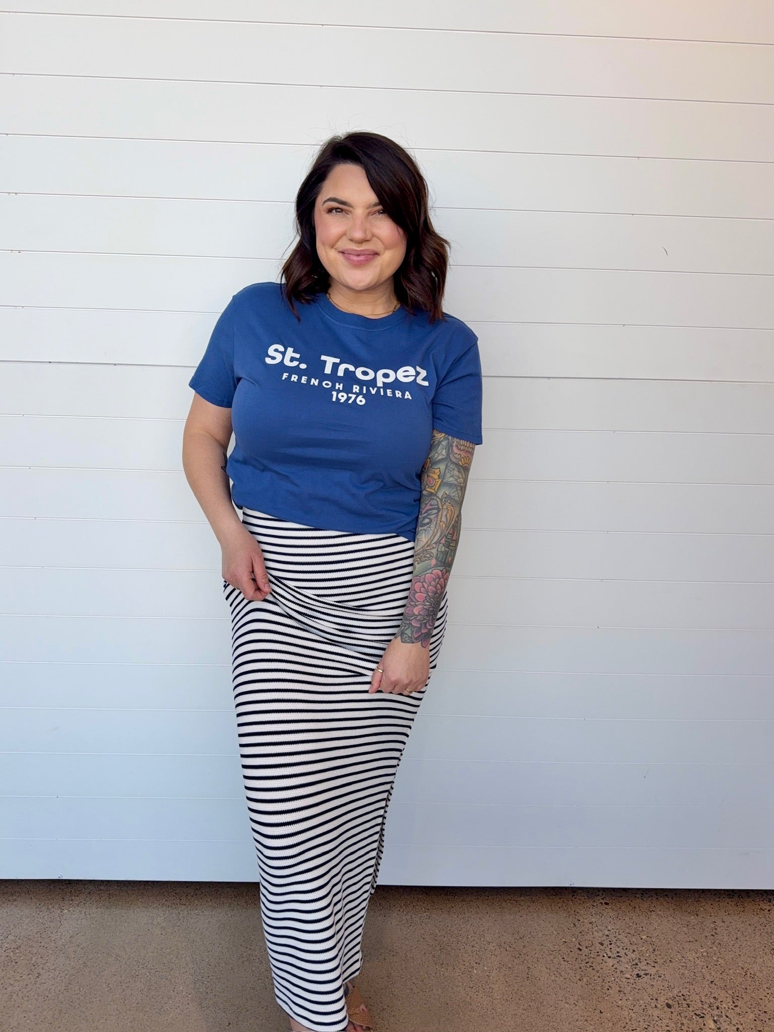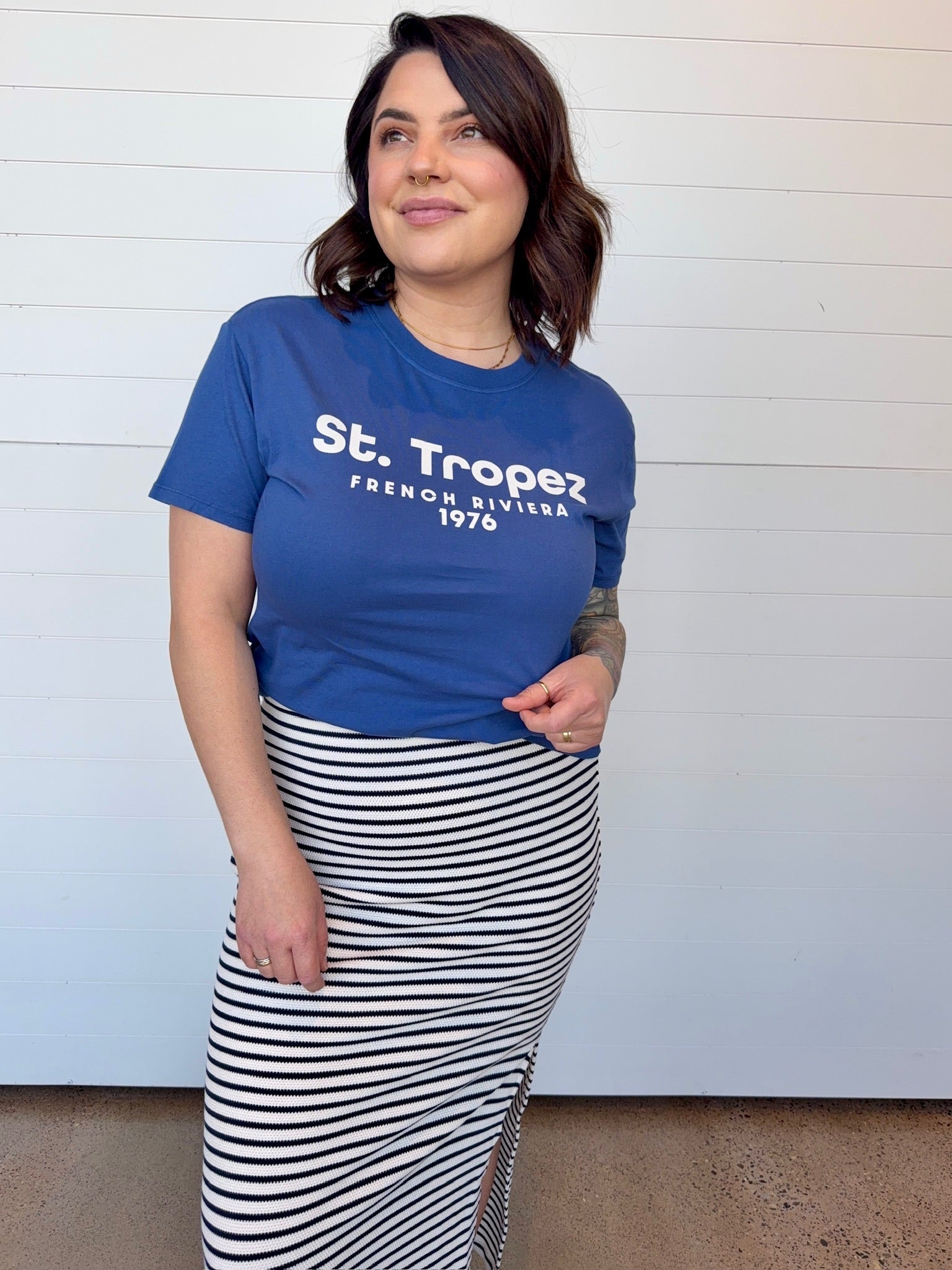 This tee is more fitted in size, so size up if you want more loose-fitting. I purchased my normal size S (S-M, 6) and it is the fit I was looking for which is not oversized. The material is nice, something to look for given the price tag. I was in search of something casual in this particular color blue to match a pair of pants. I liked purchasing from and supporting this small company. They sent a personalized note in the package. Shipping was fast. I expect some of the popular sizes to sell out.